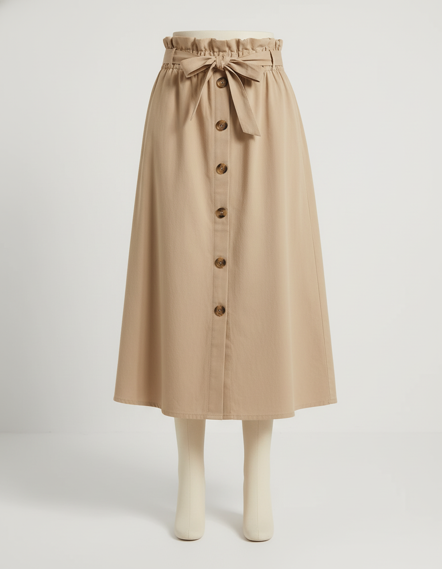 Découvrez la Jupe Boutonnée Midi, une pièce maîtresse pour une élégance décontractée sans effort. Confectionnée dans un coton évasé de qualité supérieure, sa couleur beige intemporelle se marie à merveille avec toutes vos envies. Son tombé impeccable et sa coupe évasée garantissent une liberté de mouvement inégalée, vous accompagnant avec fluidité à chaque pas. Idéale pour vos journées actives ou vos moments de détente, elle allie confort absolu et chic discret. La taille haute paperbag, agrémentée d'un délicat nœud, sublime la silhouette avec une touche féminine et raffinée.