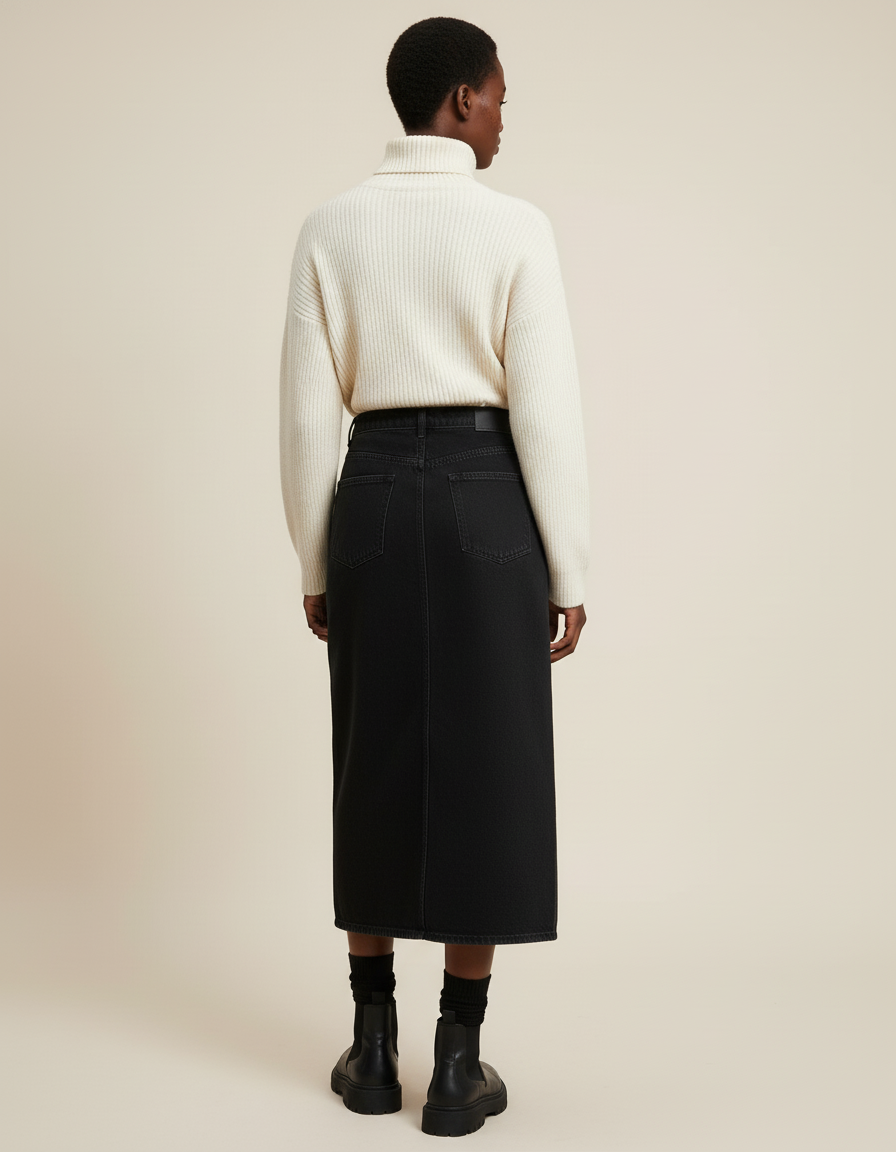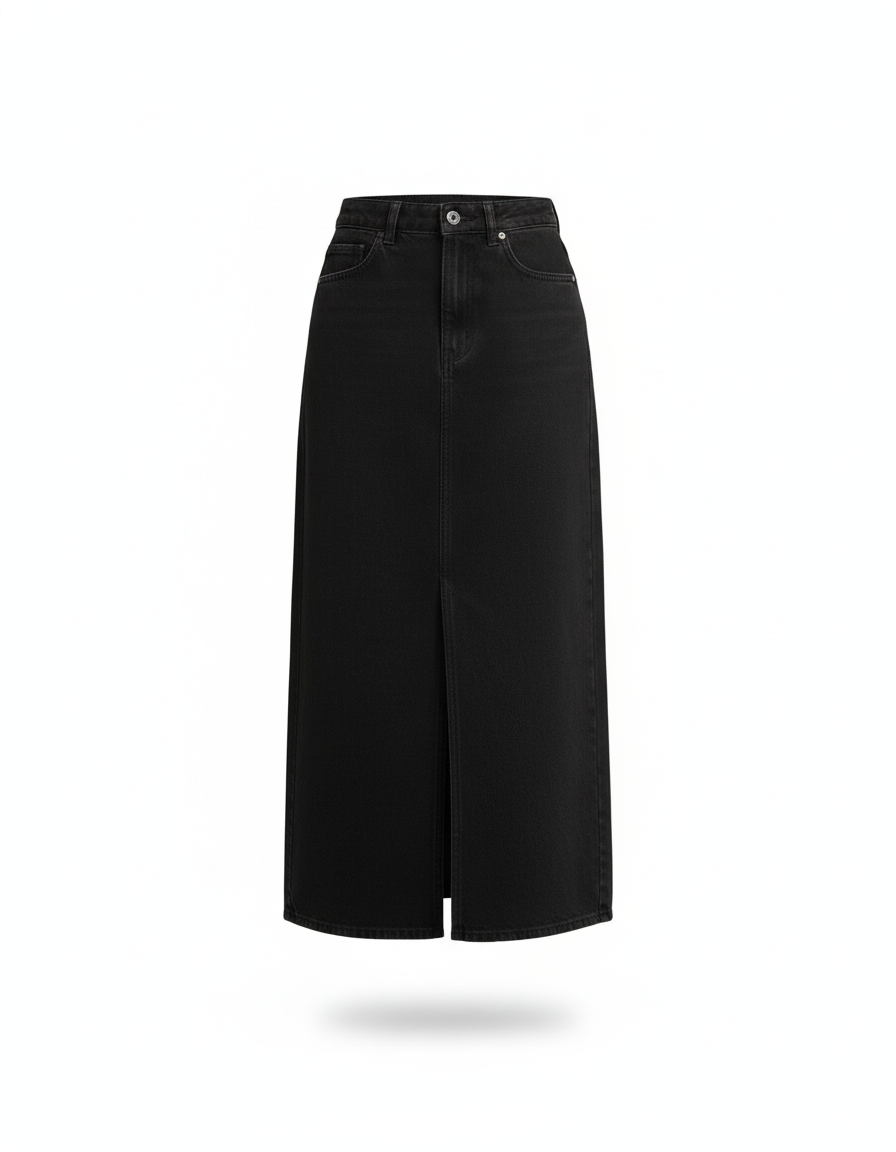 Cette jupe midi est une pièce en jean de couleur noire, caractérisée par une fente frontale.