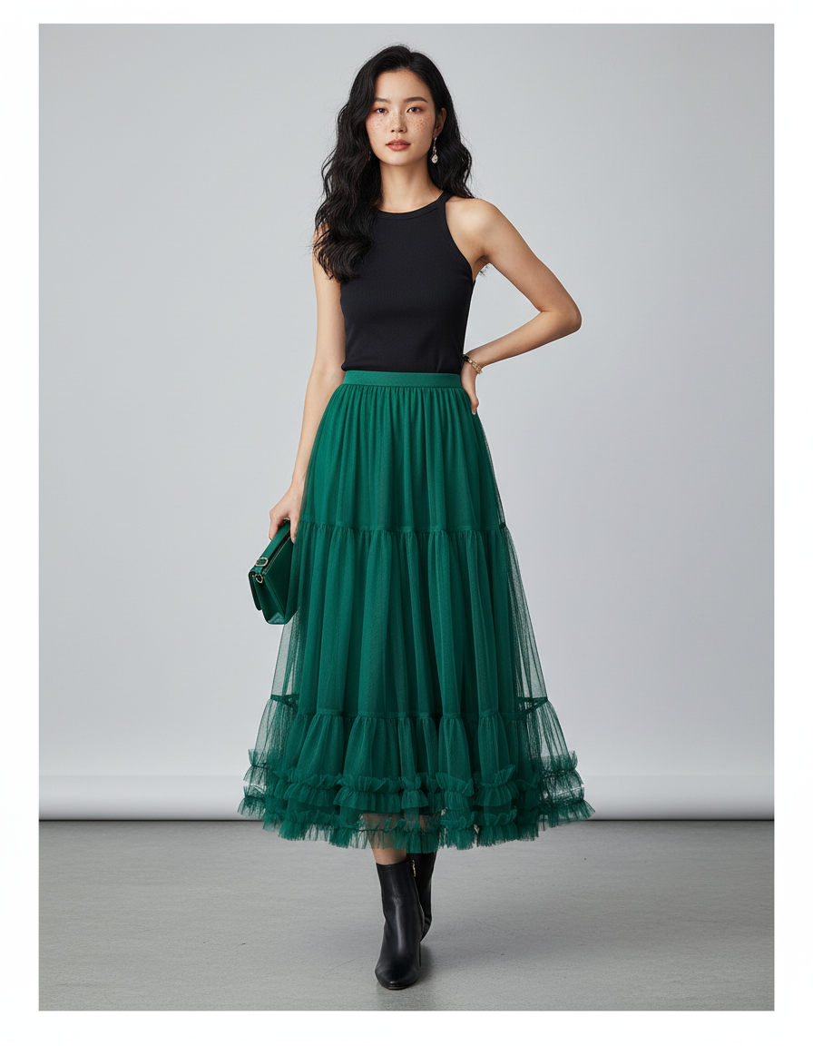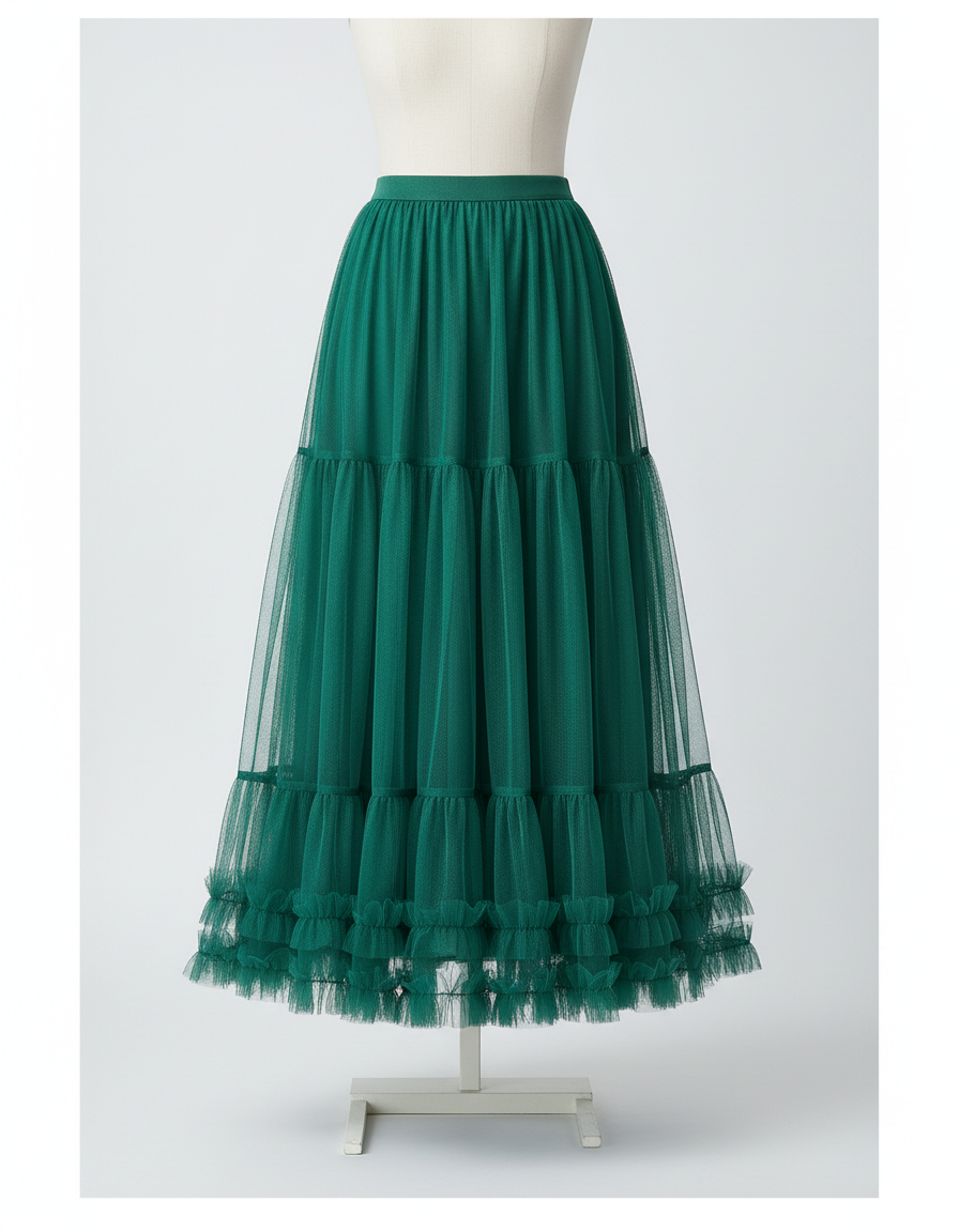 Évadez-vous dans un rêve de sophistication avec notre Jupe Longue Midi en tulle vert émeraude. Conçue pour la femme qui valorise l'élégance sans effort et une touche de fantaisie, cette pièce maîtresse transforme chaque mouvement en une danse gracieuse. Son volume aérien et ses volants délicats offrent une silhouette à la fois romantique et résolument moderne, idéale pour celles qui souhaitent exprimer leur personnalité unique avec panache. Portez-la pour un événement spécial ou pour rehausser votre quotidien, elle vous garantit une allure captivante et un confort absolu.