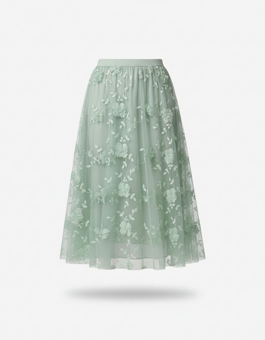 Incarnez la grâce avec notre Jupe Midi À Fleurs, une pièce maîtresse en tulle vert évasé, ornée de délicates broderies florales. Idéale pour une cérémonie, mariez-la à un top en soie ou un chemisier blanc impeccable et des sandales fines pour une allure sophistiquée et mémorable. Mais ne la cantonnez pas aux grands événements ! Pour un style plus décontracté chic, osez l'associer à un simple t-shirt blanc et une paire de baskets élégantes, ou une veste en jean pour les journées plus fraîches. Sa couleur douce et son motif raffiné s'adaptent à toutes vos envies.