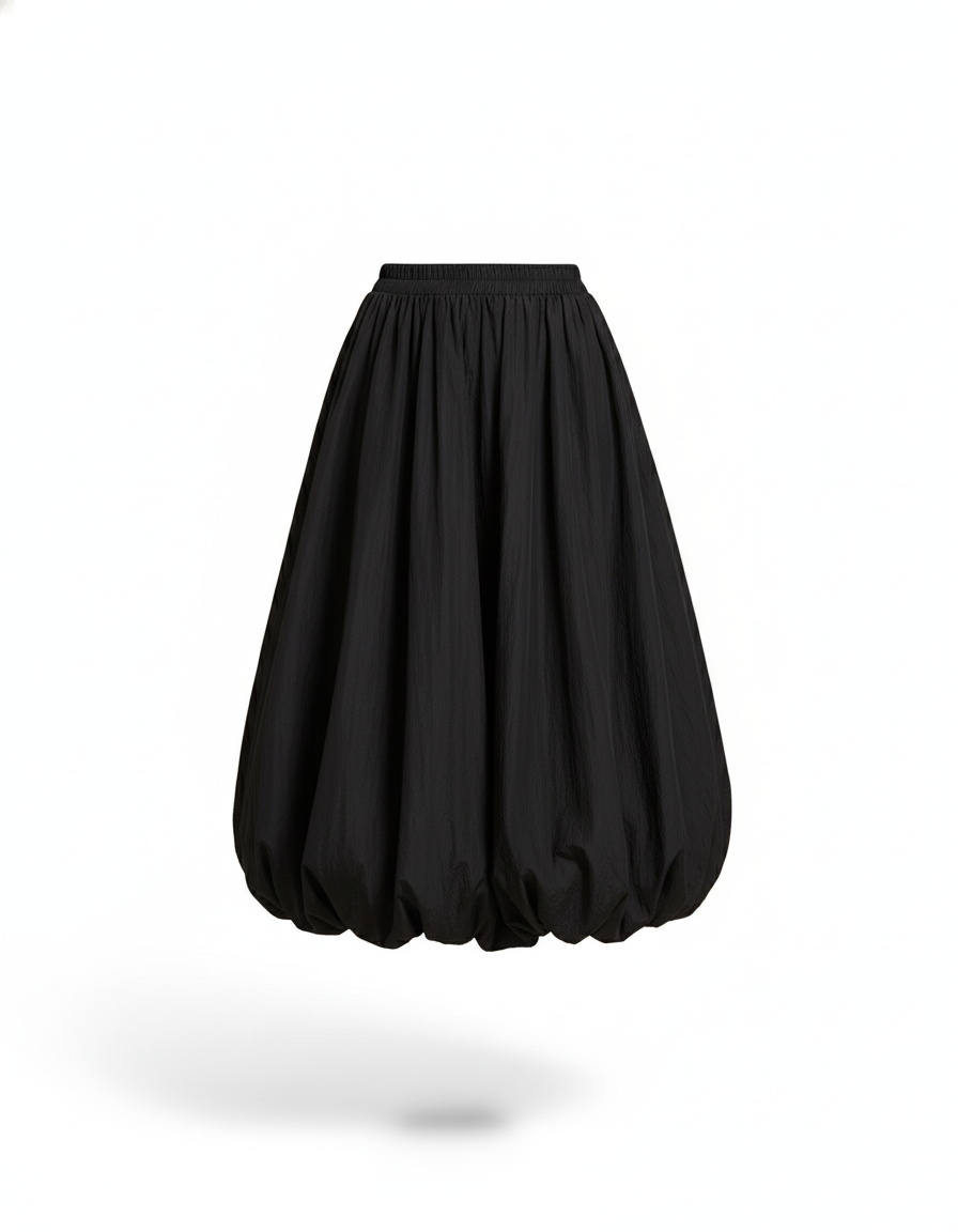 Cette jupe midi de couleur noire présente une coupe ample de style ballon, se terminant au niveau du mollet. Elle est dotée d'une taille élastiquée.