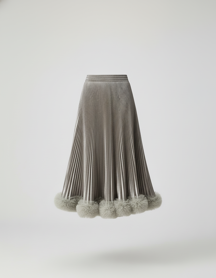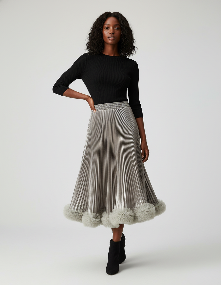Son design méticuleusement plissé capte la lumière avec une élégance fluide, tandis que sa taille midi offre une silhouette sophistiquée et polyvalente. Ce qui la rend véritablement unique et la différencie, c'est sa bordure délicatement ornée de pompons de fausse fourrure, ajoutant une touche de fantaisie luxueuse et un mouvement irrésistible. Idéale pour les événements chics, les soirées ou pour apporter une touche d'audace à vos tenues de jour, la Jupe Midi Argentée est bien plus qu'un vêtement : c'est une affirmation de style pour la femme contemporaine qui ne craint pas de s'exprimer.