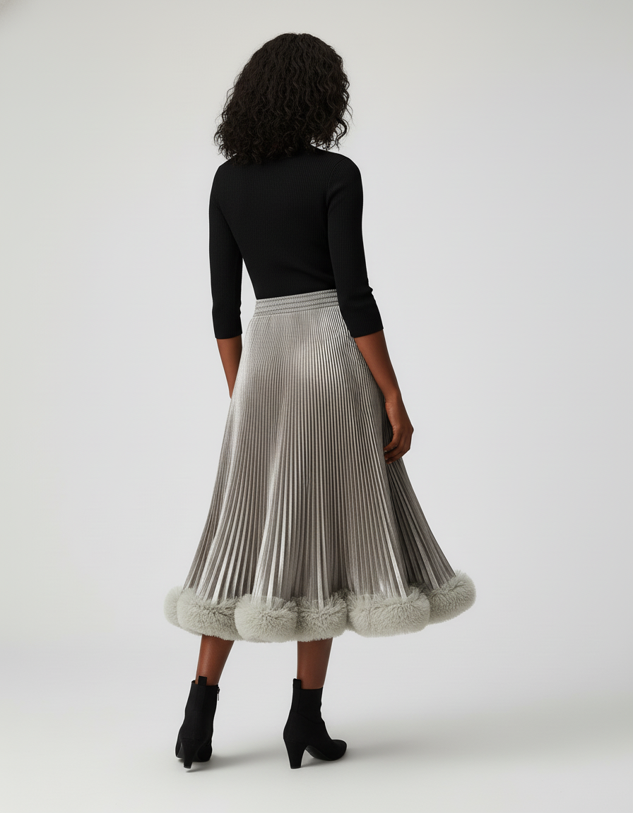 Jupe Plissée avec Ourlet en Fourrure Jupe Midi Argentée