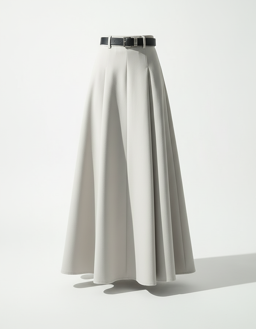 Cette jupe est une pièce longue de couleur claire, présentant une coupe évasée. Elle est portée avec une ceinture à la taille.