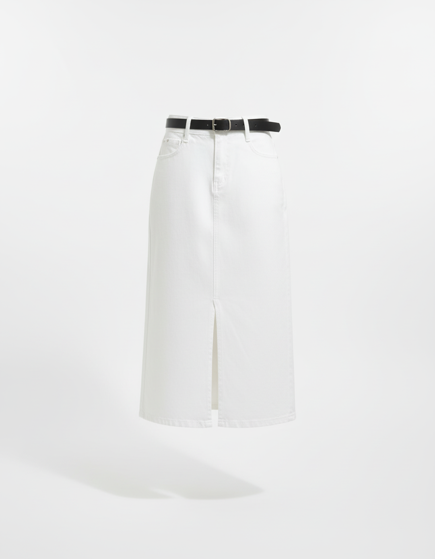 Adoptez un look moderne et décontracté avec notre jupe midi en denim blanc, parfaite pour toutes les occasions.
