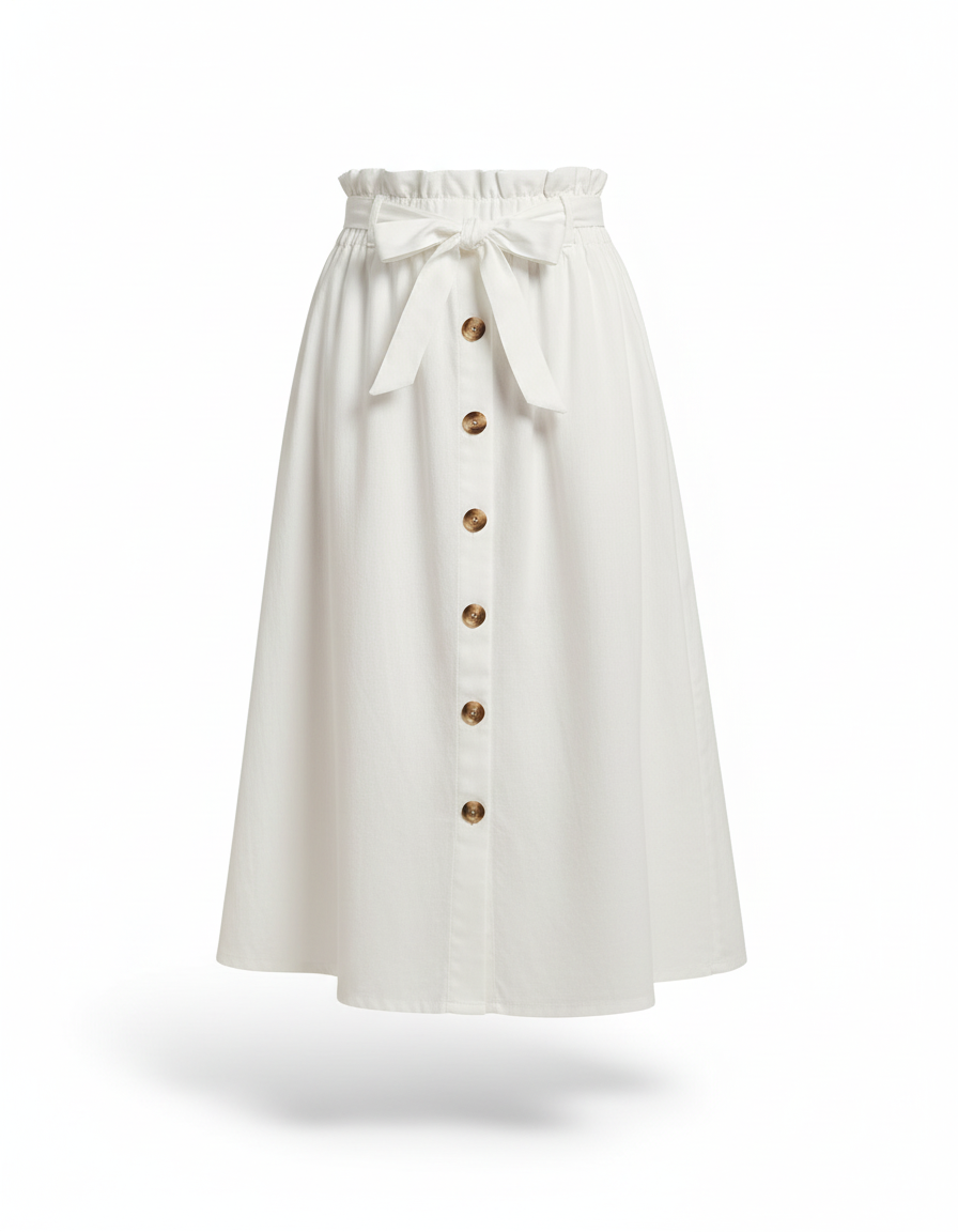 Cette jupe midi blanche présente une coupe évasée avec une taille haute élastiquée et une fermeture boutonnée sur le devant. Elle est dotée d'une ceinture à nouer assortie à la taille.
