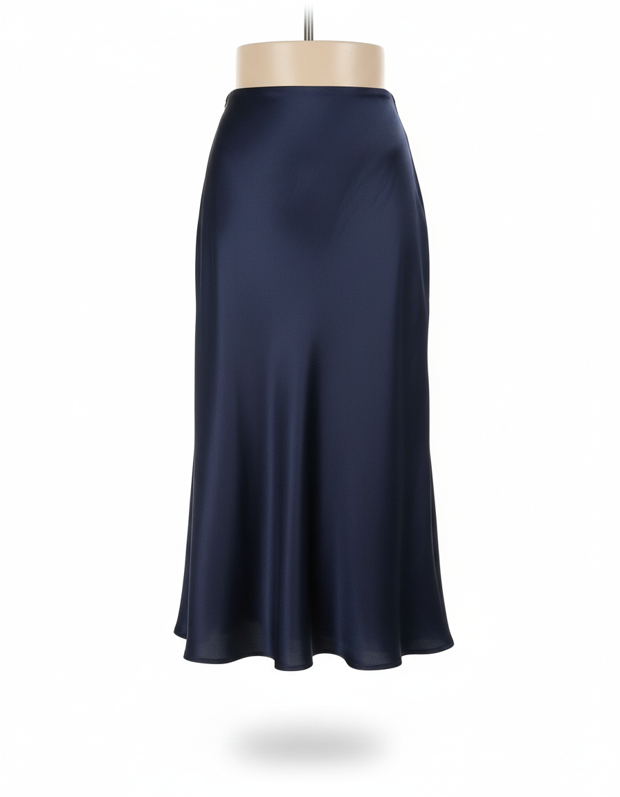 L'Élégance Sans Effort : Jupe Midi Bleu Marine Satin Fluide