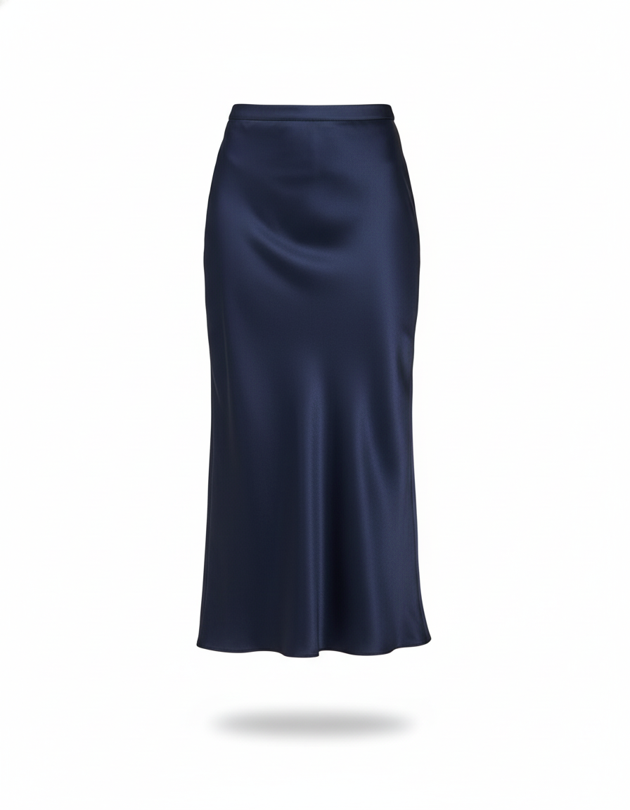Adoptez une allure sophistiquée avec notre jupe midi en satin bleu marine, parfaite pour toutes les occasions.