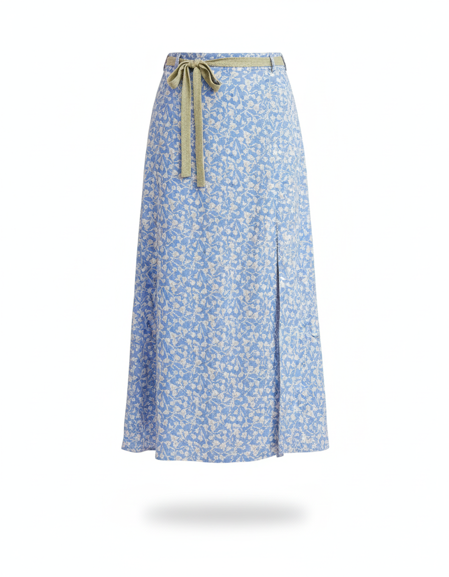 La jupe midi est de couleur bleue avec un motif floral blanc. Elle présente une fente latérale sur le côté gauche.