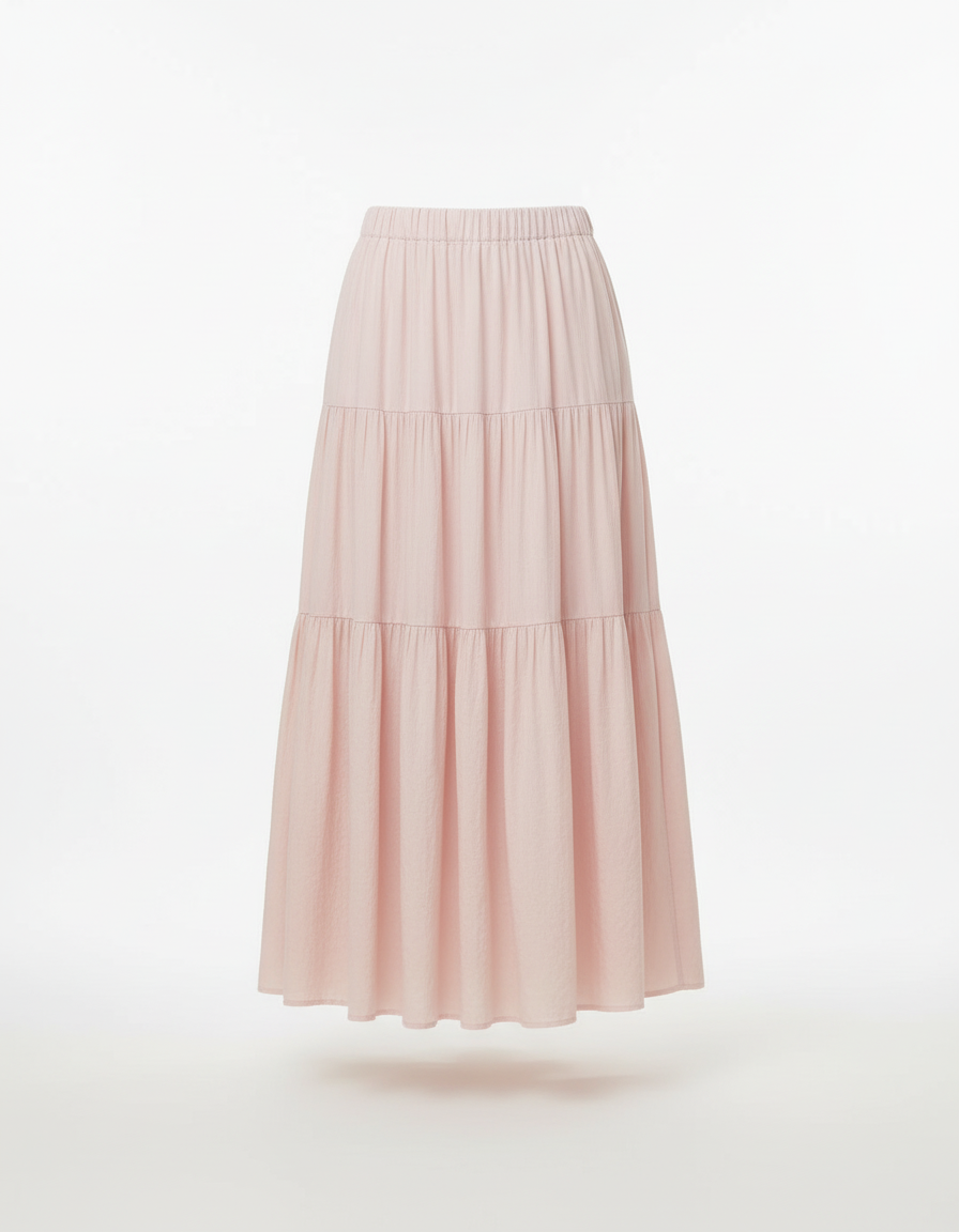 Cette jupe midi présente une coupe ample avec plusieurs niveaux de tissu. Elle est de couleur rose clair et atteint une longueur sous le genou.