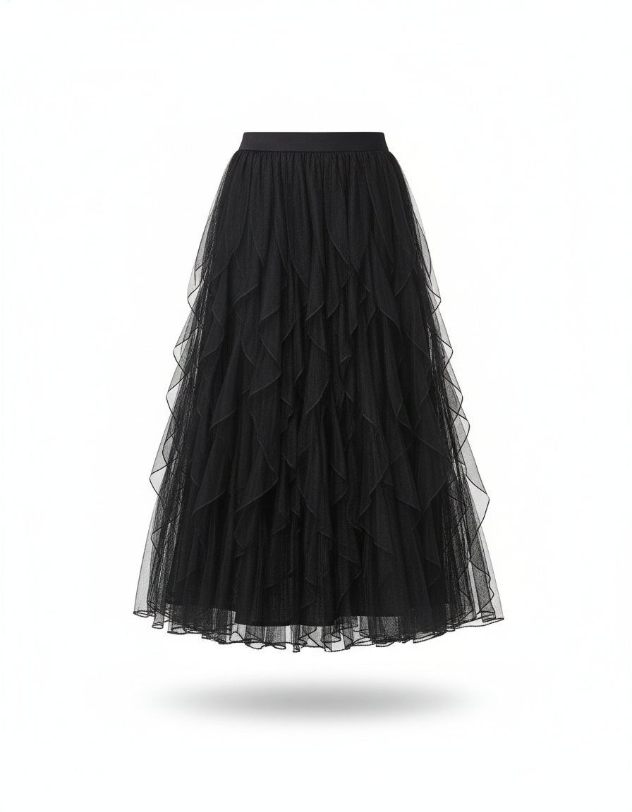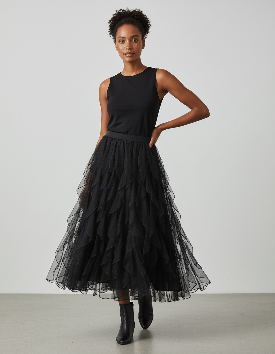 Son design unique, caractérisé par des volants de tulle superposés, crée un mouvement fluide et une texture riche qui attirent le regard. La couleur noire intemporelle garantit une polyvalence inégalée, se mariant parfaitement avec des bottines pour un look résolument contemporain et chic, ou des talons pour une allure plus classique. Loin des clichés, la Jupe Midi Bottines est une invitation à exprimer votre personnalité avec raffinement. C'est l'investissement parfait pour une garde-robe qui allie luxe, modernité et une promesse de style unique en toute occasion.