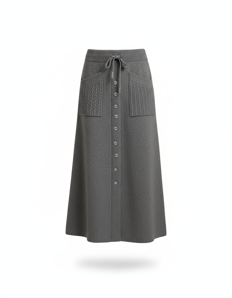 Sa maille de haute qualité, d'un gris intemporel, offre une tenue impeccable et une sensation agréable sur la peau, garantissant durabilité et facilité d'entretien. La coupe trapèze flatte toutes les silhouettes, tandis que la rangée de boutons subtils sur le devant ajoute une touche de caractère unique. Pratique et stylée, sa taille élastiquée ajustable par un cordon et ses poches plaquées ornées de détails tressés ne sont pas seulement esthétiques ; elles témoignent d'une conception pensée pour votre quotidien. La Jupe Midi Bouton se distingue par son équilibre parfait entre fonctionnalité et sophistication, vous offrant une pièce distinctive pour une allure toujours impeccable.