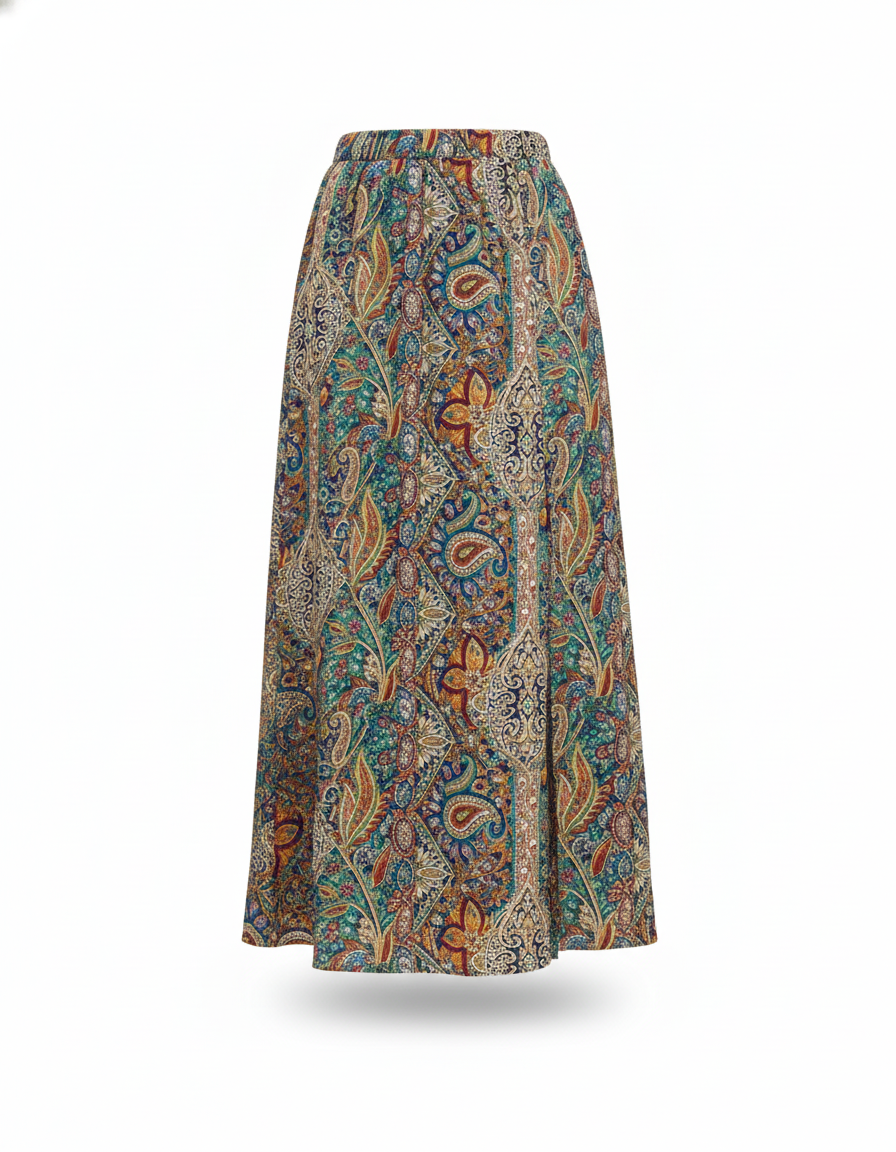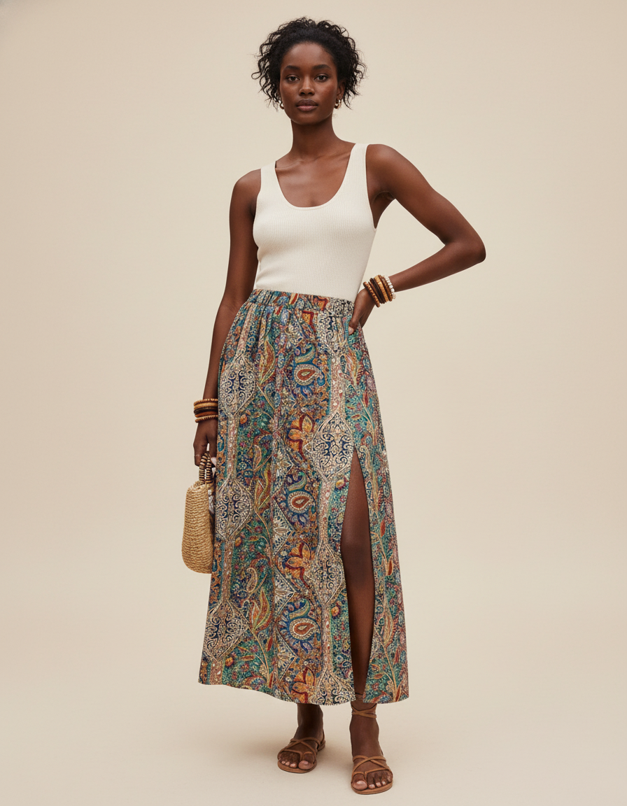 Cette Jupe Midi Cachemire Fendue Bohème présente un motif de style cachemire et une fente sur le côté. Sa coupe est longue et fluide, s'arrêtant à mi-mollet.