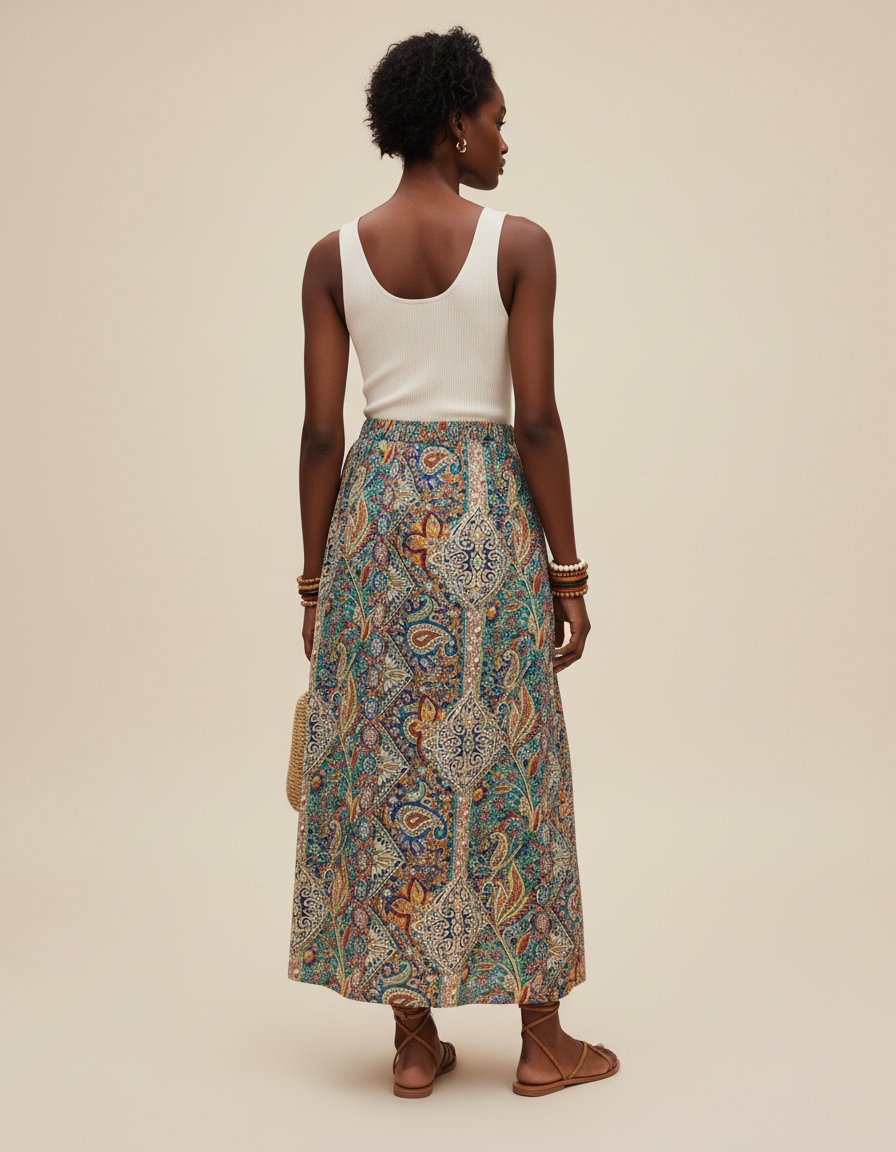 Conçue en viscose fluide de haute qualité, notre Jupe Midi Cachemire Fendue Bohème vous enveloppe d'une douceur inégalée. Son tombé parfait épouse délicatement votre silhouette sans jamais restreindre, tandis que sa fente discrète offre une liberté de mouvement absolue, idéale pour flâner sous le soleil ou danser les nuits d'été. Le motif cachemire multicolore, riche et sophistiqué, est une véritable ode à l'évasion, promesse d'une élégance sans effort et d'un confort durable, du matin au soir.