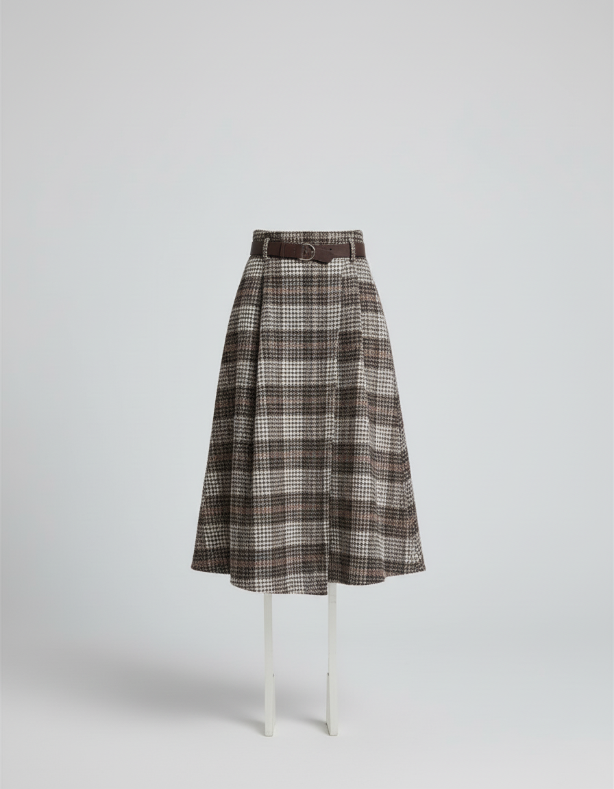 Ce qui distingue notre Jupe Midi, c'est l'alliance parfaite entre l'authenticité du tweed de laine et une coupe évasée contemporaine. Ses motifs à carreaux, dans des nuances de marron et de beige, apportent une touche sophistiquée et une profondeur visuelle unique. Confectionnée avec un soin artisanal, elle garantit une tenue impeccable et un confort durable, faisant d'elle un investissement dans votre style personnel. Une pièce qui célèbre l'art de s'habiller avec distinction et modernité.