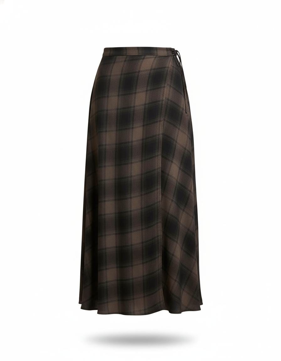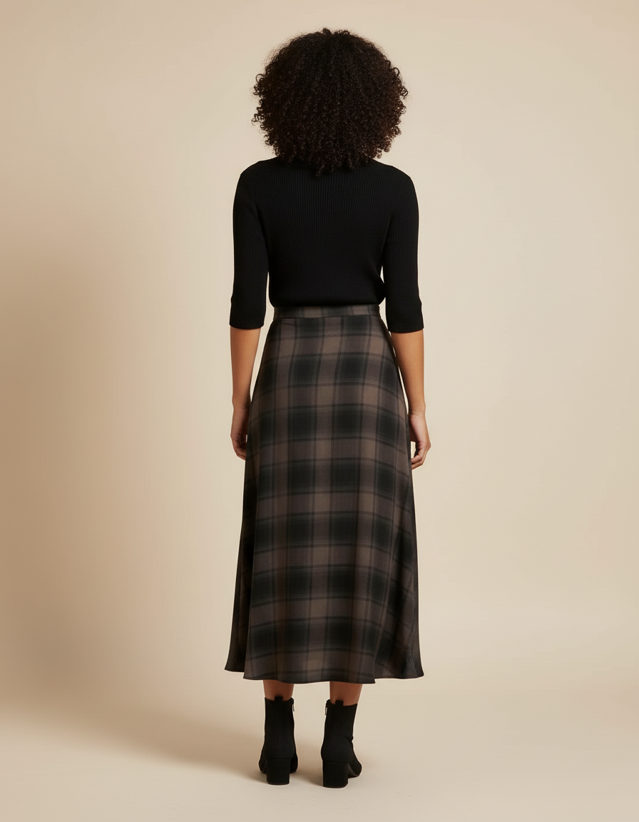 Adoptez un look sophistiqué et intemporel avec notre jupe midi portefeuille à motif carreaux, conçue pour allier style et aisance.