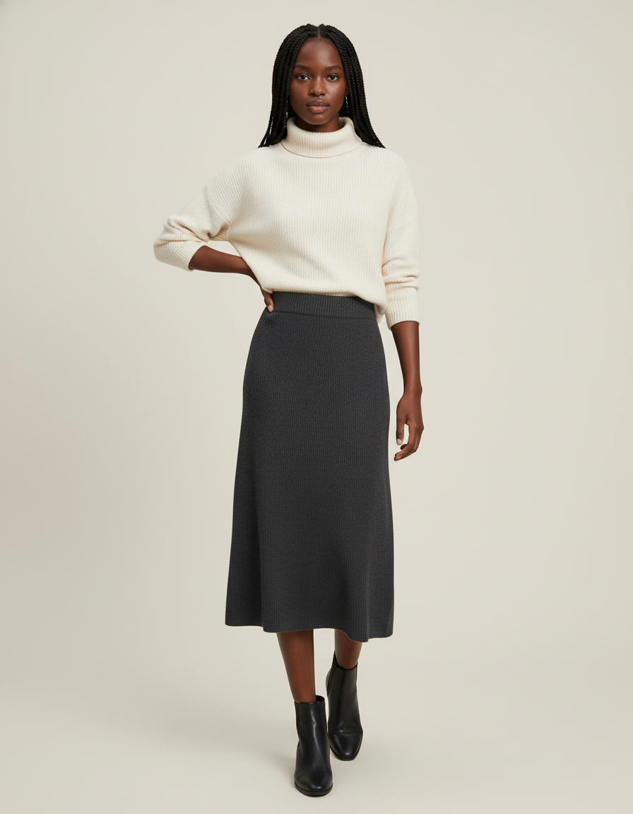 Adoptez l'élégance décontractée avec notre jupe midi côtelée anthracite, parfaite pour toutes les occasions.