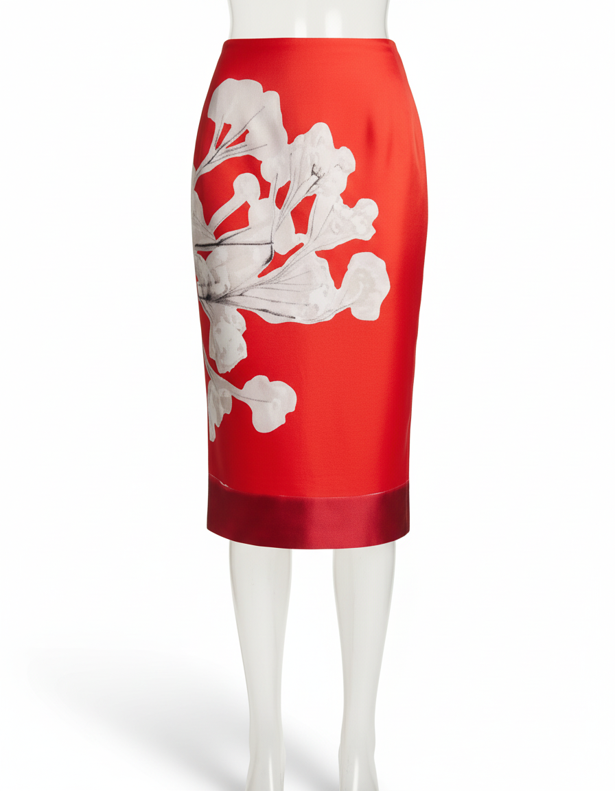 Cette jupe midi présente une coupe crayon, s'étendant sous le genou. Elle est de couleur rouge avec un motif floral blanc et gris sur le devant.