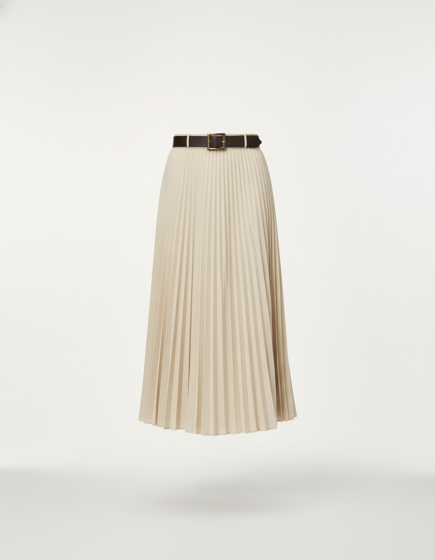 Cette jupe midi de couleur crème présente une coupe évasée avec des plis réguliers sur toute sa longueur, s'arrêtant à mi-mollet.