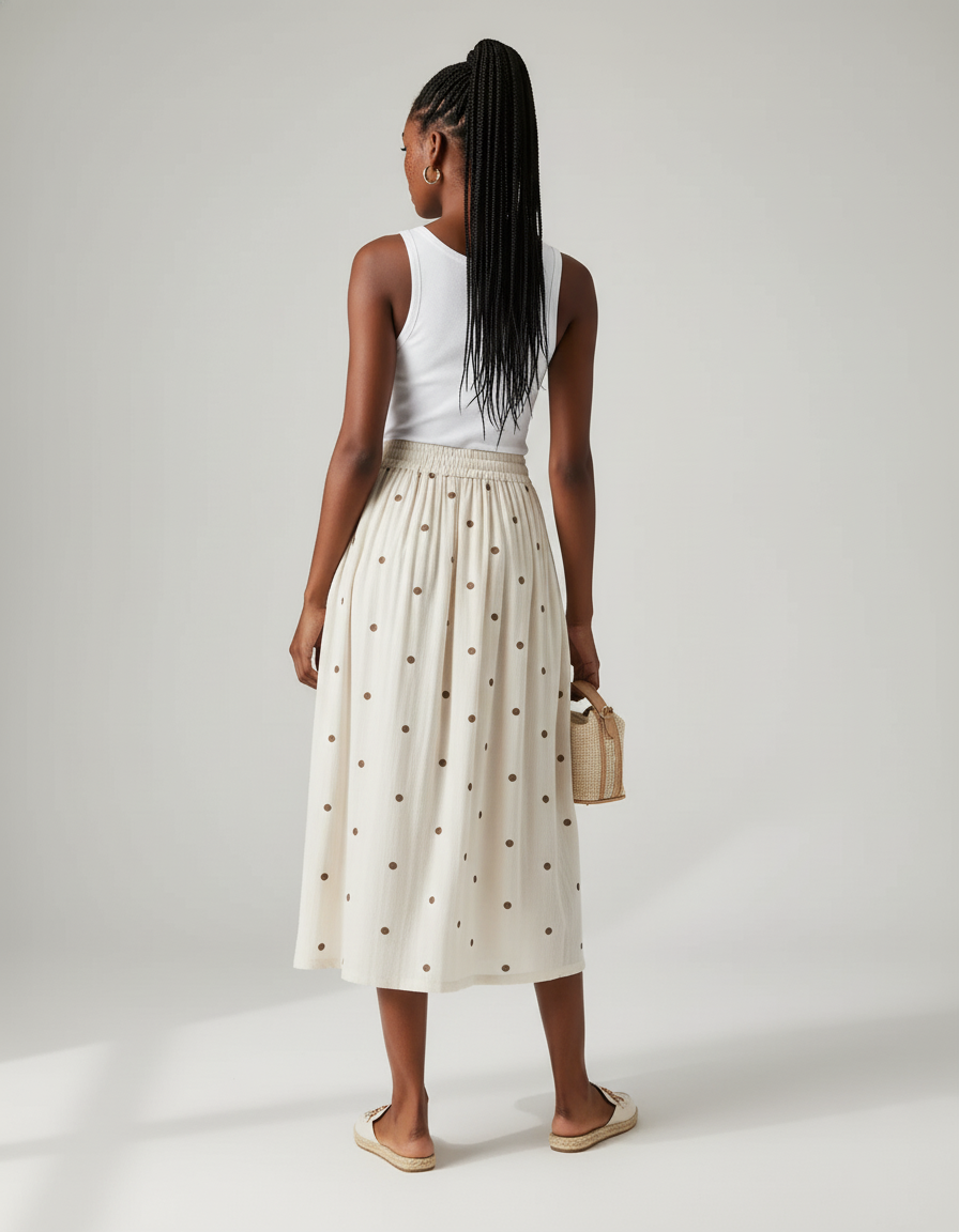 La Jupe Midi Crème Pois Fluide : Votre Essentiel Chic pour Toutes les Évasions