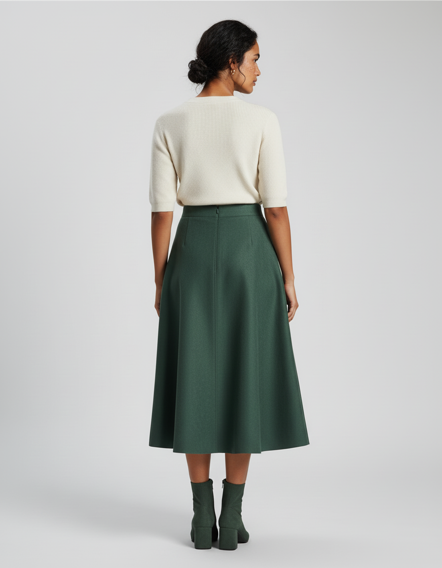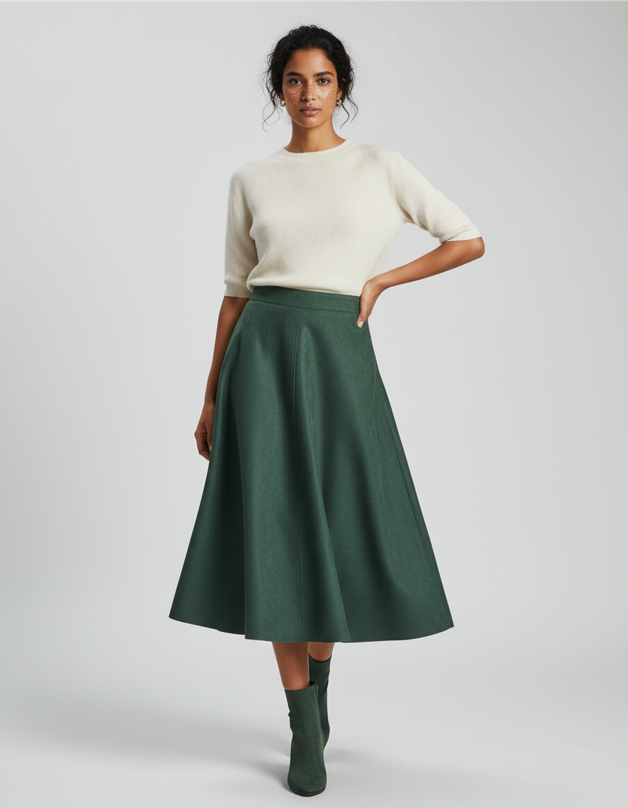 Polyvalente par excellence, la Jupe Midi Évasée se prête à une multitude d'interprétations. Pour un look professionnel raffiné, associez-la à un chemisier en soie et des escarpins classiques. Envie d'une touche plus décontractée mais toujours chic après le travail ? Osez la porter avec un pull en cachemire fin et des bottines élégantes, comme sur l'image, pour une allure sophistiquée et confortable. Son vert profond est facile à marier et apporte une note de couleur distinctive à vos ensembles, affirmant votre style avec discrétion et assurance, du matin au soir.
