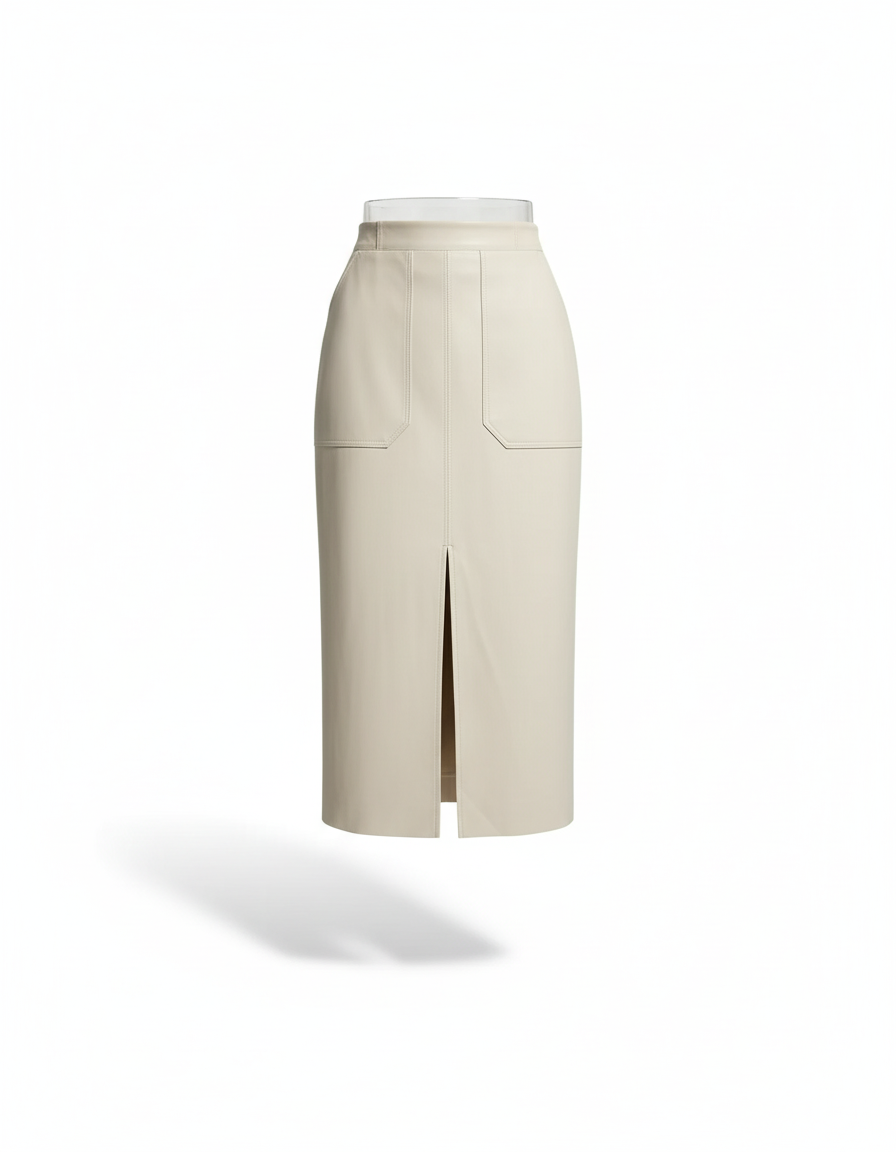 Cette jupe midi est confectionnée en faux cuir de couleur crème. Elle présente une fente sur le devant et deux poches plaquées.