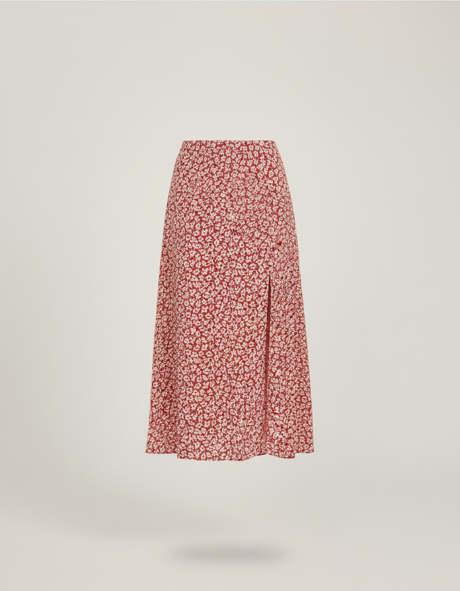 Succombez au charme intemporel de notre Jupe Midi Fleurie Fendue Élégante, pièce maîtresse de votre garde-robe estivale et printanière. Sa teinte rouge vibrante, parsemée d'un délicat motif floral, insuffle une touche de fraîcheur et de sophistication à chaque tenue. La fente subtilement placée ajoute une dimension moderne et une allure gracieuse, parfaite pour flâner en ville avec un simple crop top et des sandales plates, ou pour une soirée élégante avec un chemisier en soie et des talons. C'est la pièce idéale pour exprimer votre féminité avec audace et raffinement, quelle que soit l'occasion.