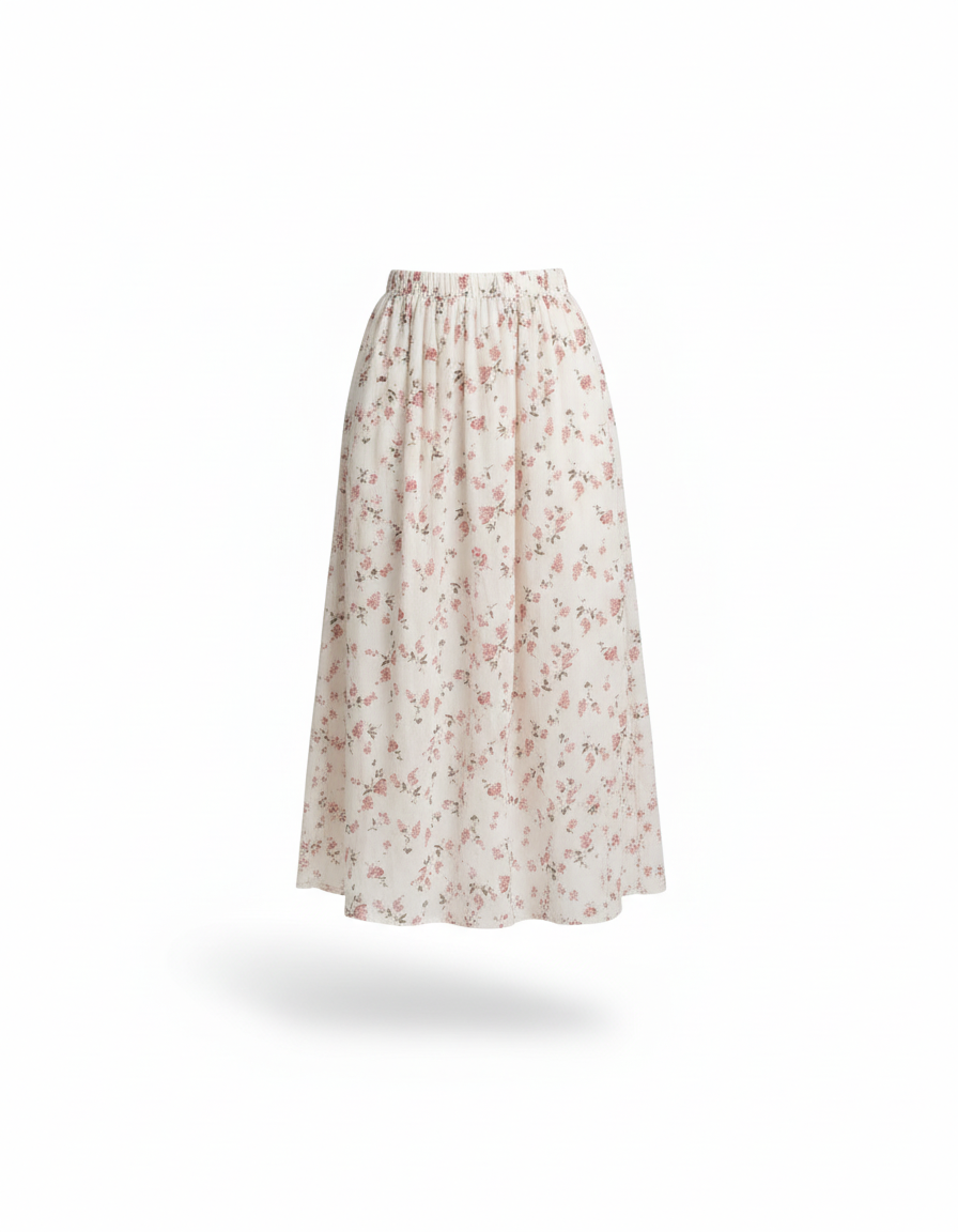 Cette jupe midi fleurie présente un motif floral sur un fond clair. Elle est dotée d'une taille élastiquée et d'une coupe évasée, rappelant un style plissé.