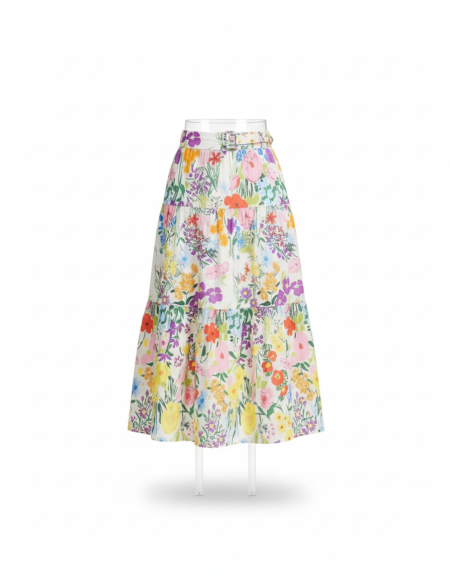 Cette jupe midi est ornée d'un motif floral multicolore sur un fond clair. Elle présente une coupe à volants et une taille élastique.