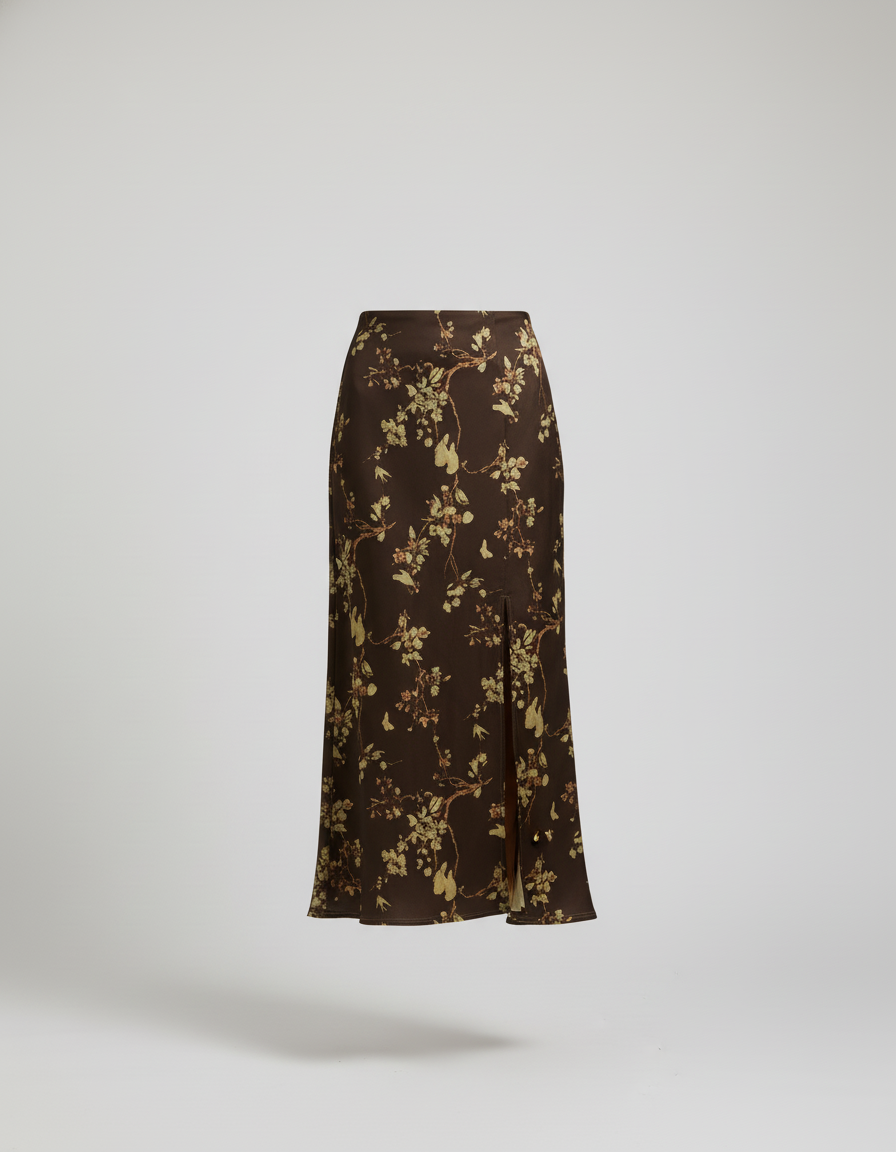 Cette jupe longue présente un motif floral sur un fond marron foncé. Elle est dotée d'une fente latérale sur le devant.