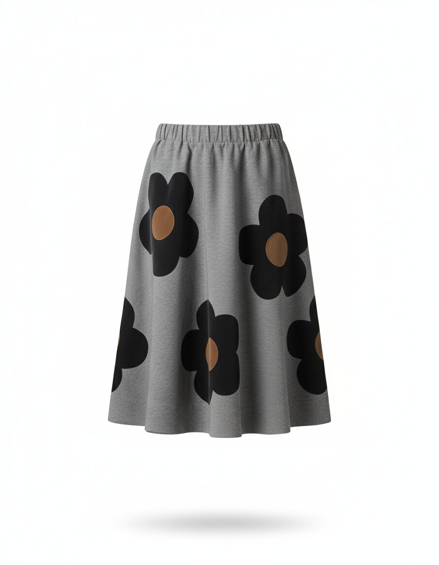 La jupe midi est de couleur grise et présente de grands motifs floraux noirs avec un centre marron. Elle est dotée d'une taille élastiquée et d'une coupe évasée.