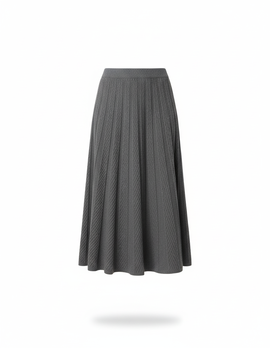Cette jupe midi présente une couleur grise unie et un design plissé avec une texture en maille.