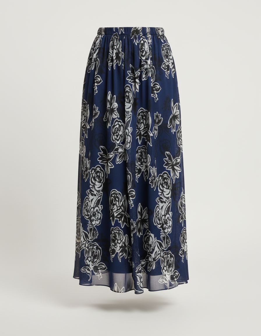 Ce qui distingue notre jupe évasée, c'est son mariage parfait entre une mousseline marine d'une qualité exceptionnelle et un motif floral exclusif. Chaque fleur, aux contours délicats, semble flotter sur le tissu, offrant un mouvement hypnotisant à chaque pas. Sa coupe midi flatteuse allonge la silhouette, tandis que sa matière légère promet un confort inégalé tout au long de la journée. Un investissement dans le style, une promesse de distinction.