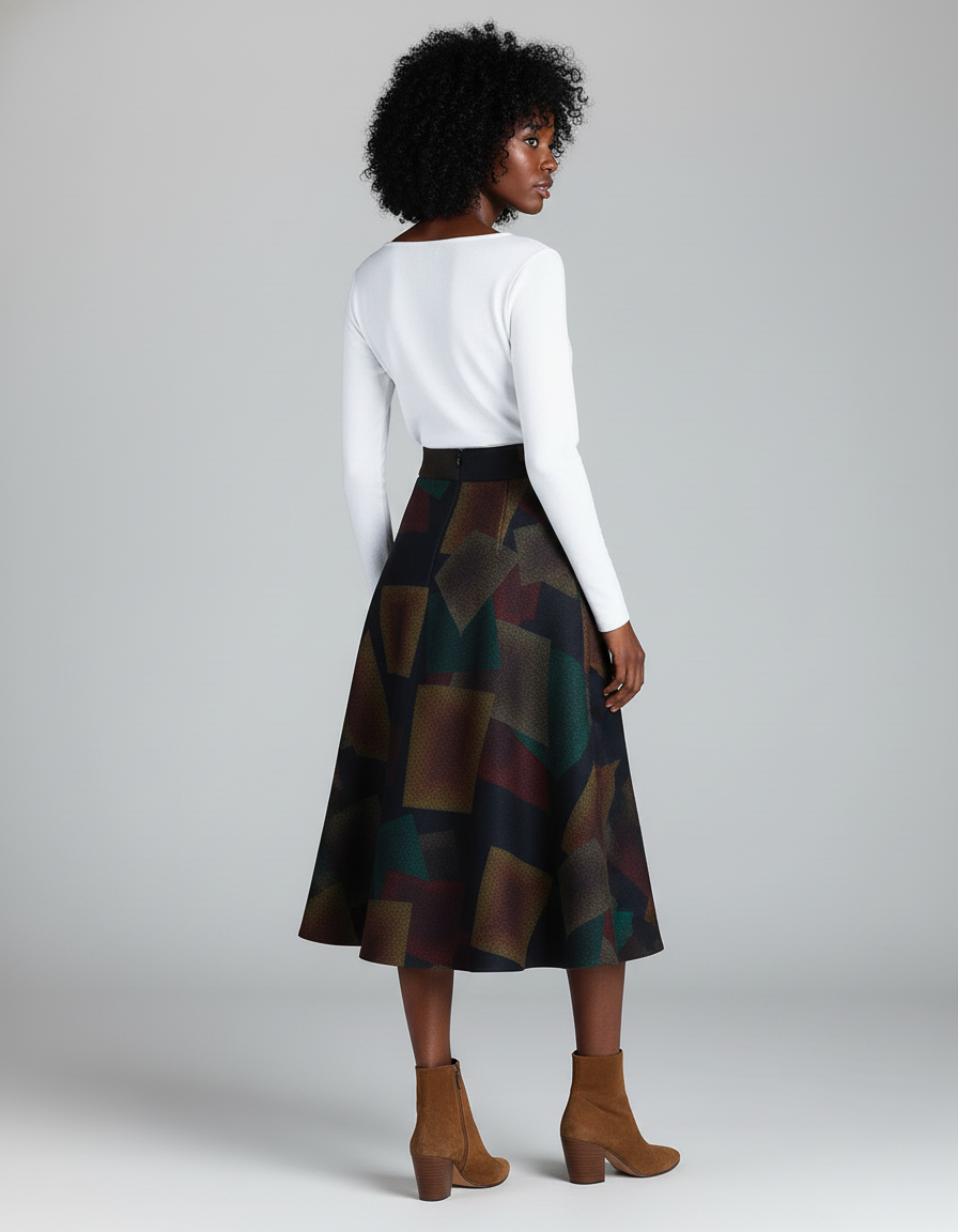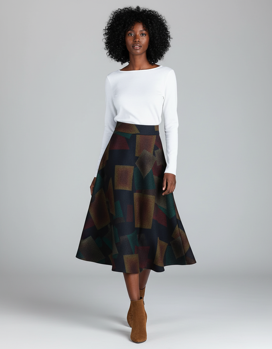 Cette jupe midi présente un motif géométrique sur un fond sombre. Sa coupe évasée s'étend de la taille jusqu'à mi-mollet.