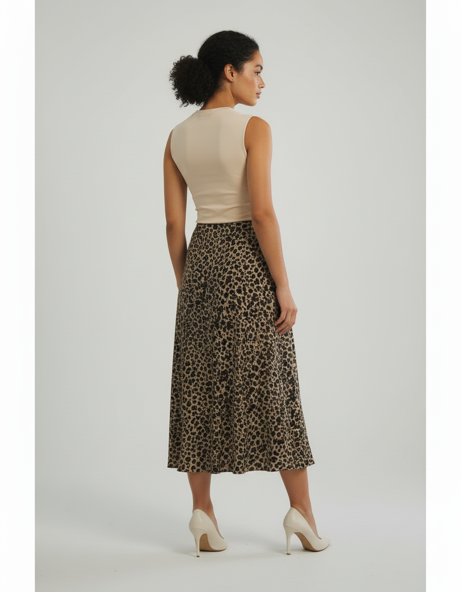 Adoptez un style audacieux et chic avec notre jupe midi imprimée léopard, parfaite pour toutes les occasions.