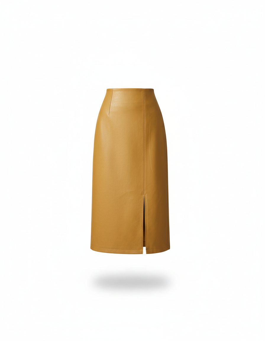 Cette jupe midi jaune cuir chic présente une coupe droite avec une fente avant. Elle est conçue dans un matériau à l'aspect cuir et possède une taille haute.