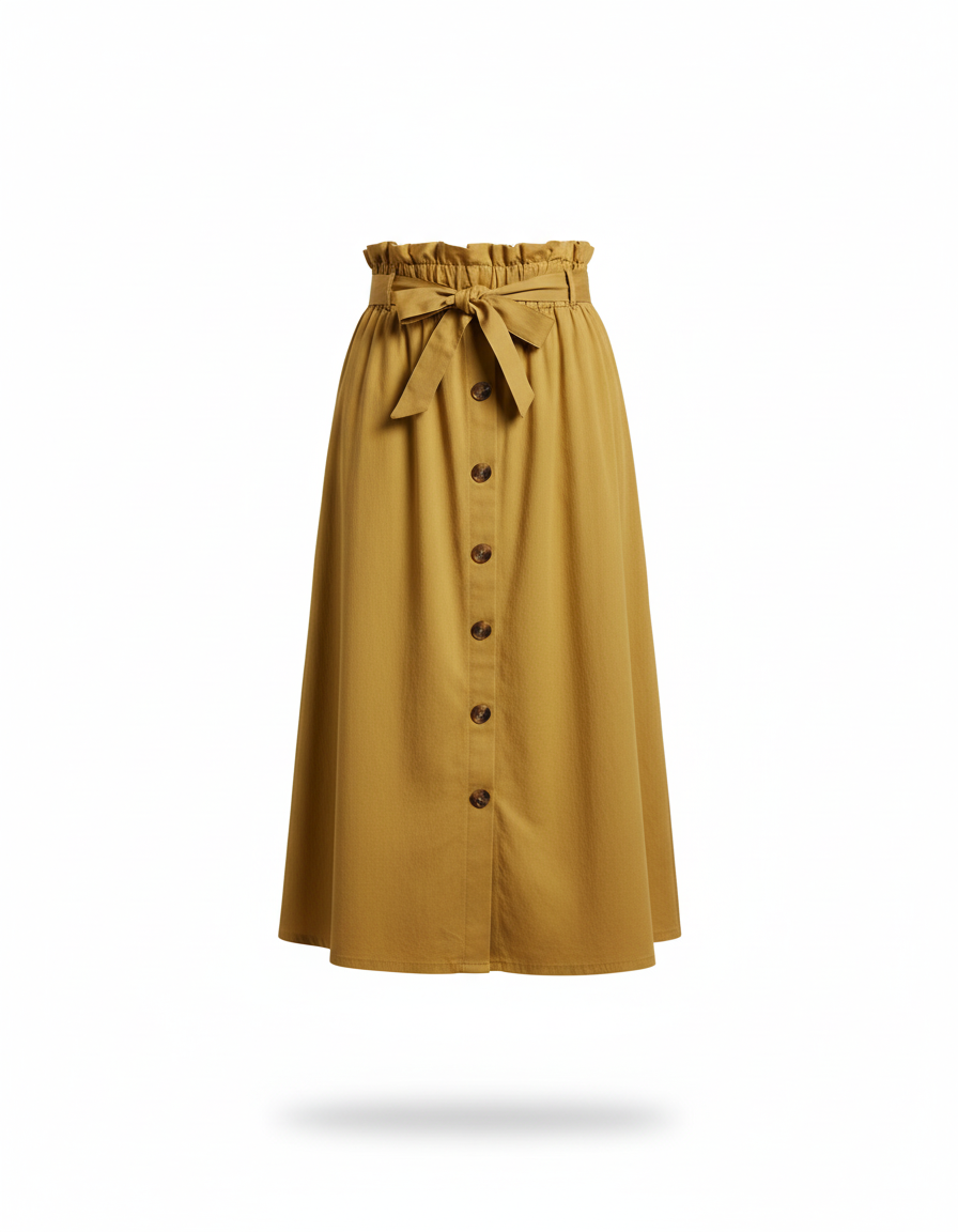 Jupe Midi Jaune Moutarde à Taille Haute Boutonnée