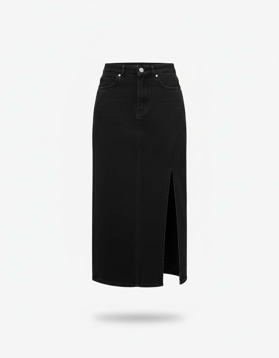 Cette jupe midi est confectionnée en jean noir. Elle présente une coupe droite et une fente sur le devant.