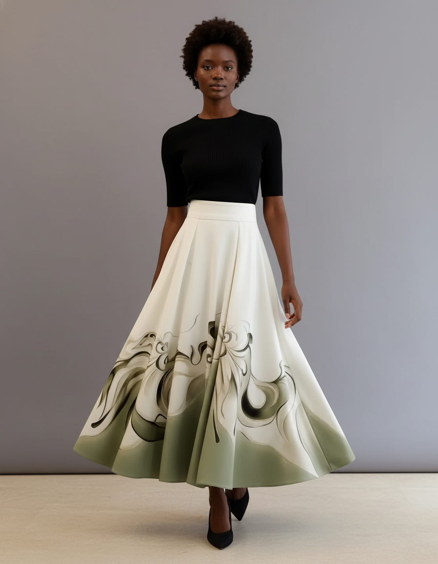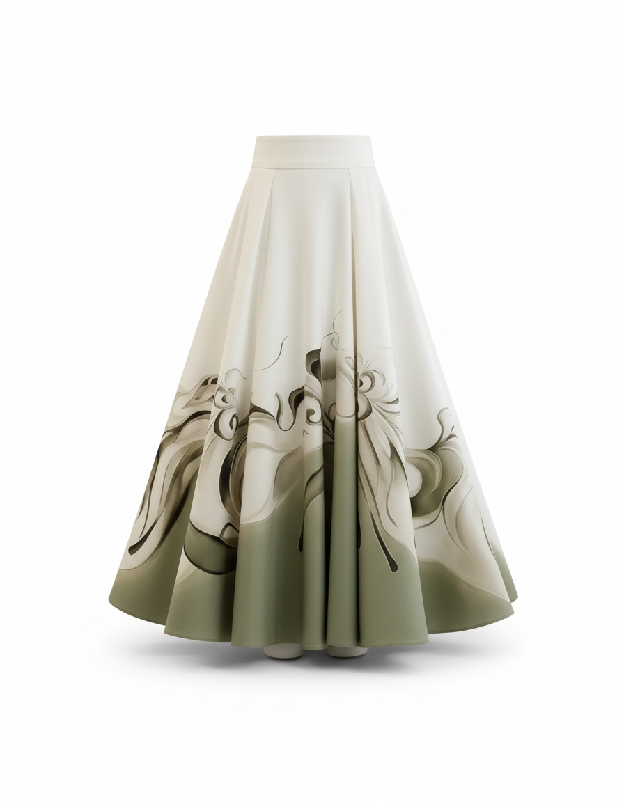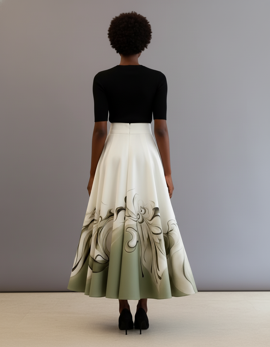 Cette jupe midi présente une coupe évasée avec un dégradé de couleur kaki vers l'ourlet. Elle est ornée d'un motif abstrait de tourbillons sur sa partie inférieure.