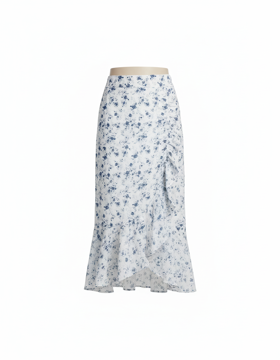 Cette jupe midi présente un motif floral Liberty sur un fond blanc. Elle est dotée d'une taille élastique et d'un ourlet à volants asymétrique.