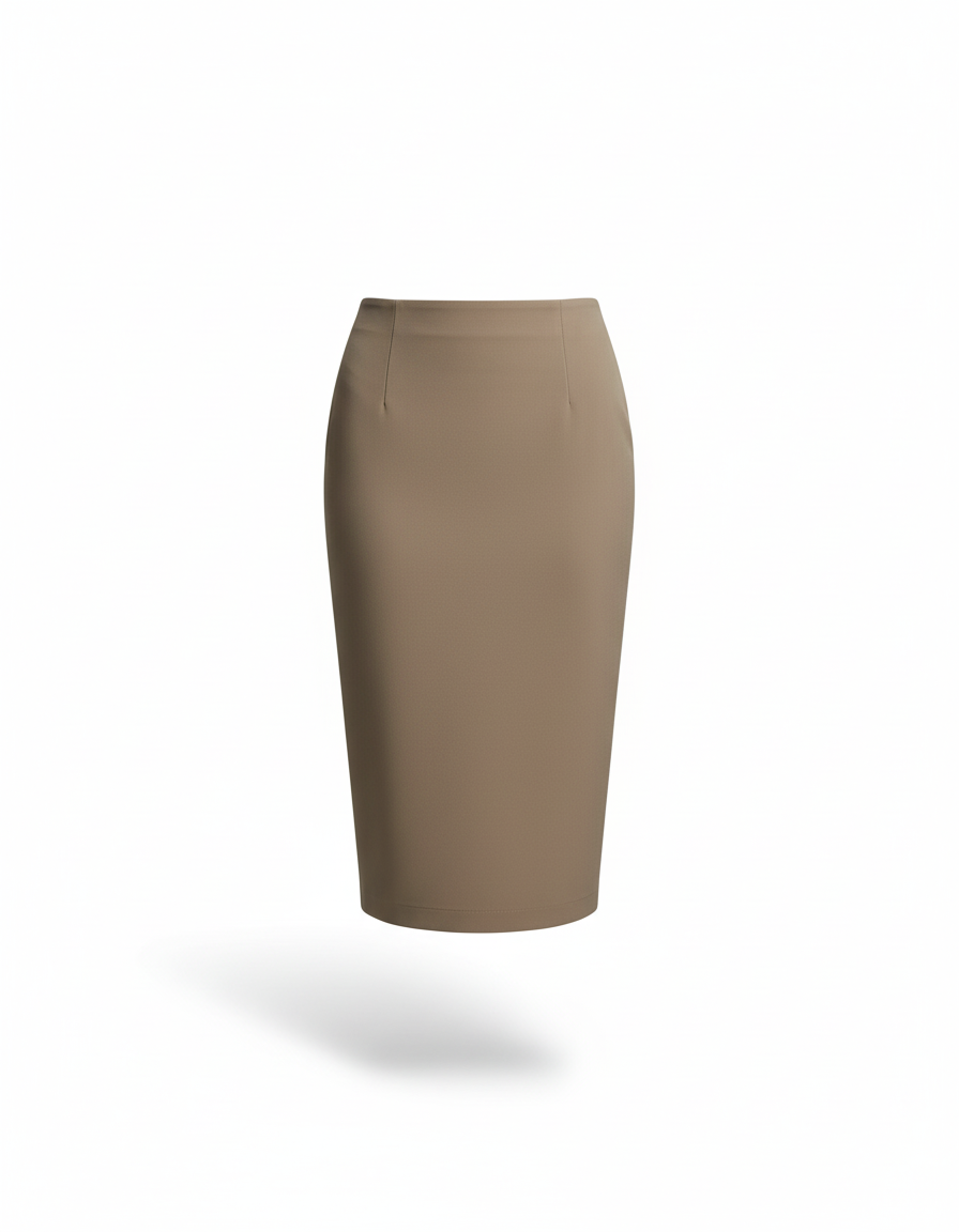 Cette jupe midi présente une coupe droite ajustée et une taille haute. Elle est confectionnée dans un tissu uni à l'aspect lisse, s'arrêtant sous le genou.