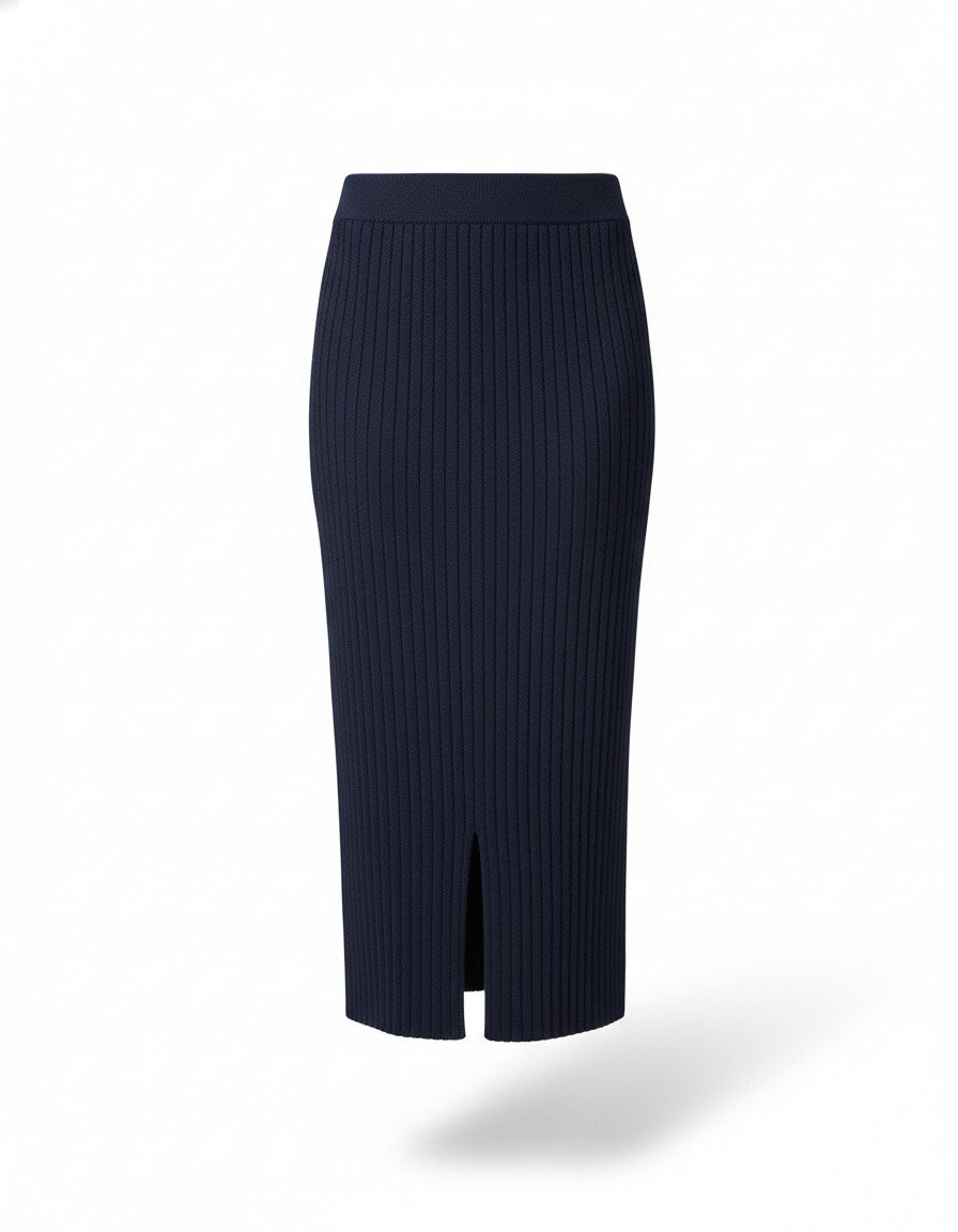 Cette jupe midi est de couleur marine et présente une texture côtelée. Elle a une coupe droite et une fente discrète sur le devant, atteignant le mollet.
