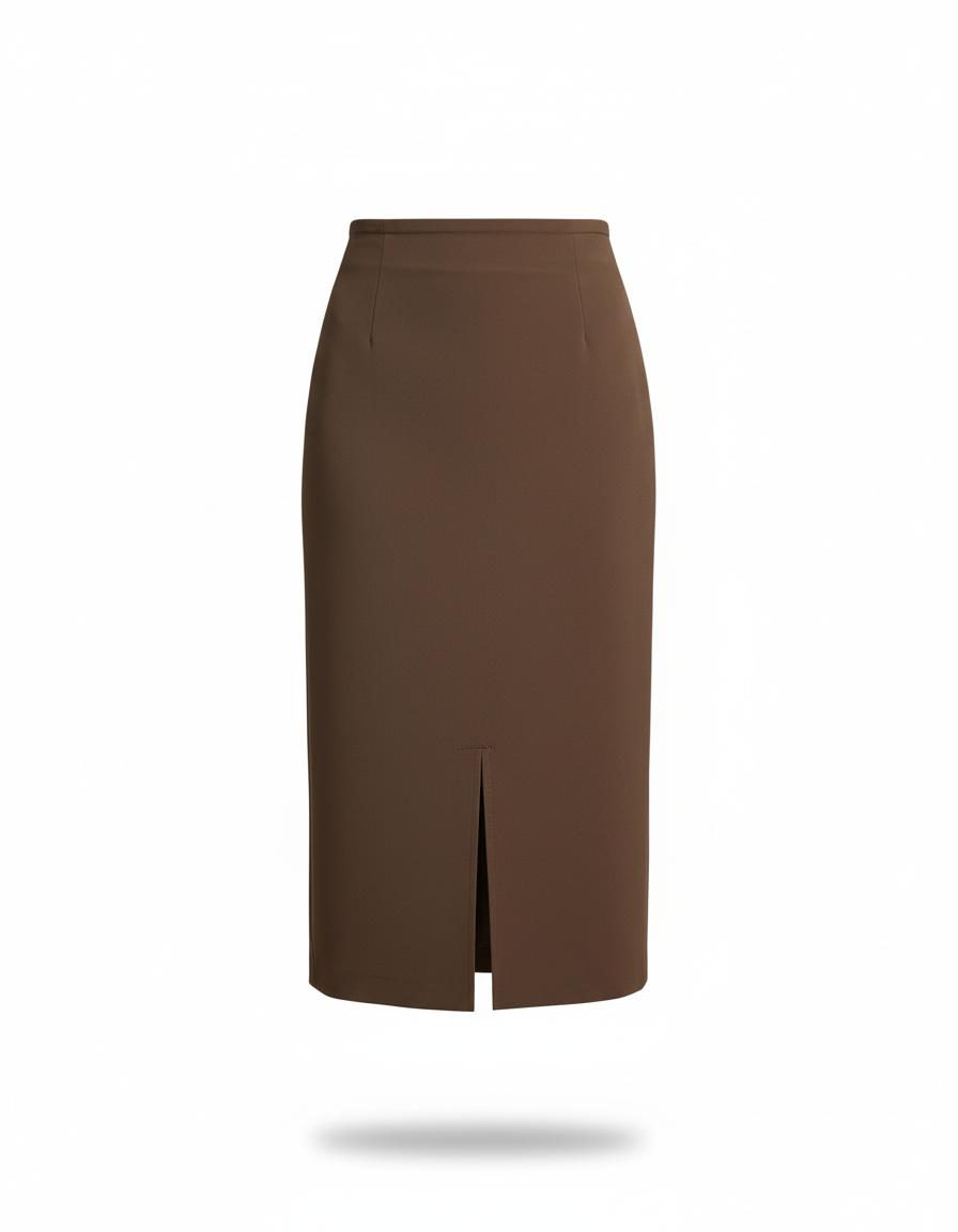 Cette jupe midi de couleur marron présente une coupe droite et une fente discrète sur le devant.