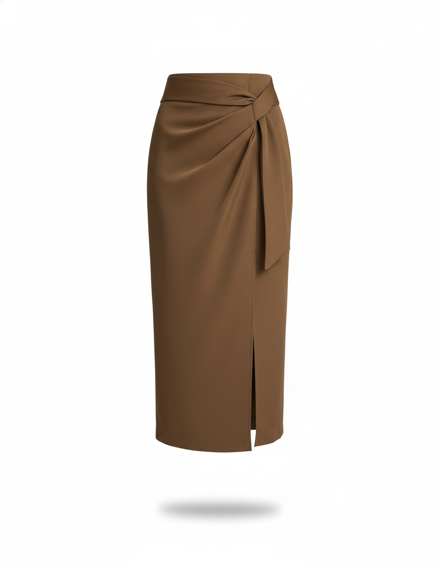 Jupe Midi Marron Portefeuille Chic avec Nœud Latéral