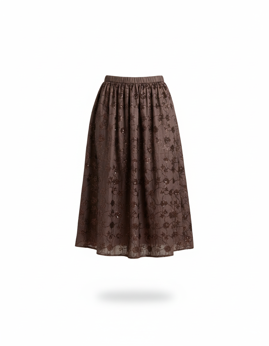 Jupe Midi Marron Sequins Élégante avec Motifs Brodés