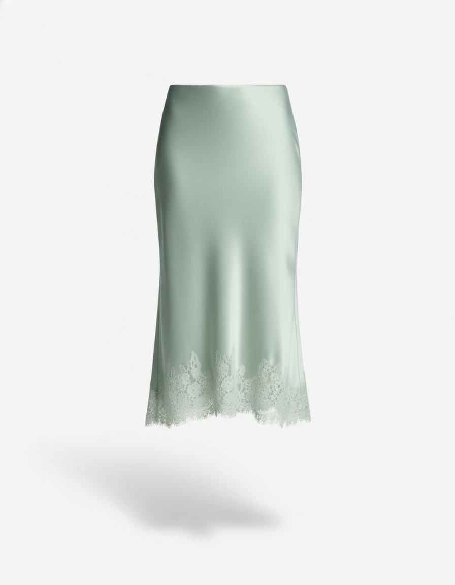 Cette jupe midi est confectionnée en satin de couleur menthe. Elle présente une coupe fluide et un ourlet orné de dentelle.