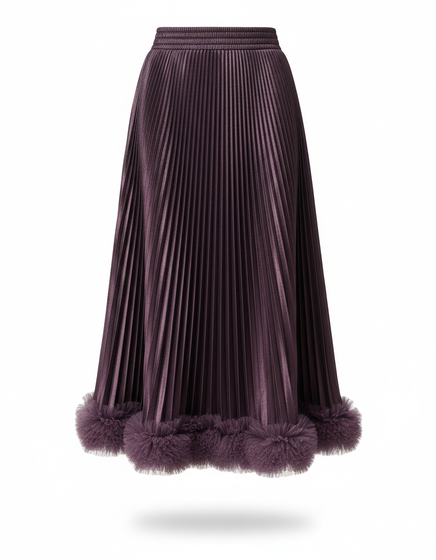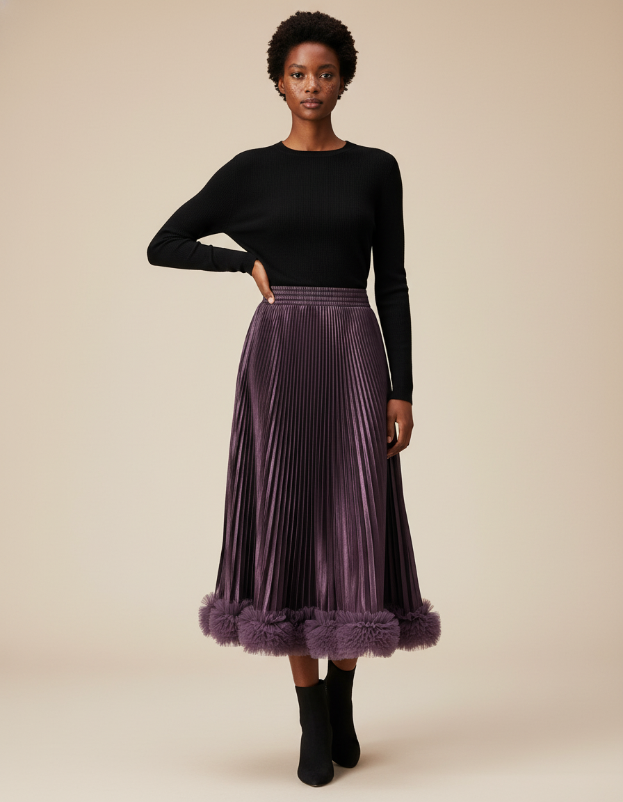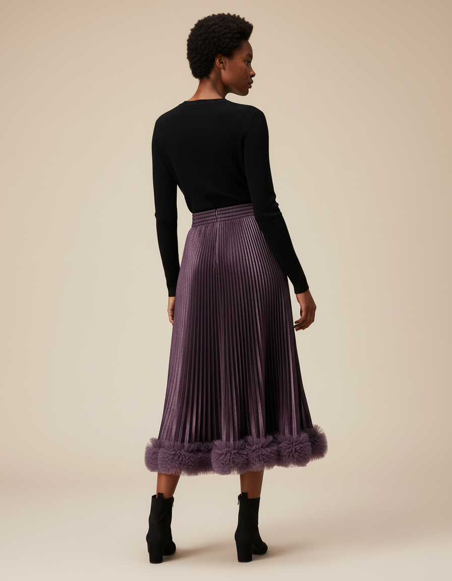 Ce qui distingue notre Jupe Midi Métallisée, c'est son savoir-faire exceptionnel et ses détails audacieux. Le satin plissé, d'une richesse violette profonde, est travaillé pour créer un jeu de textures et de reflets métallisés absolument captivant. Sa coupe midi, à la fois classique et contemporaine, est sublimée par un détail de finition unique : une bordure délicatement texturée qui ajoute une touche de fantaisie chic. C'est la pièce maîtresse qui transformera n'importe quel ensemble en une déclaration de style, symbolisant un luxe discret mais indéniable.