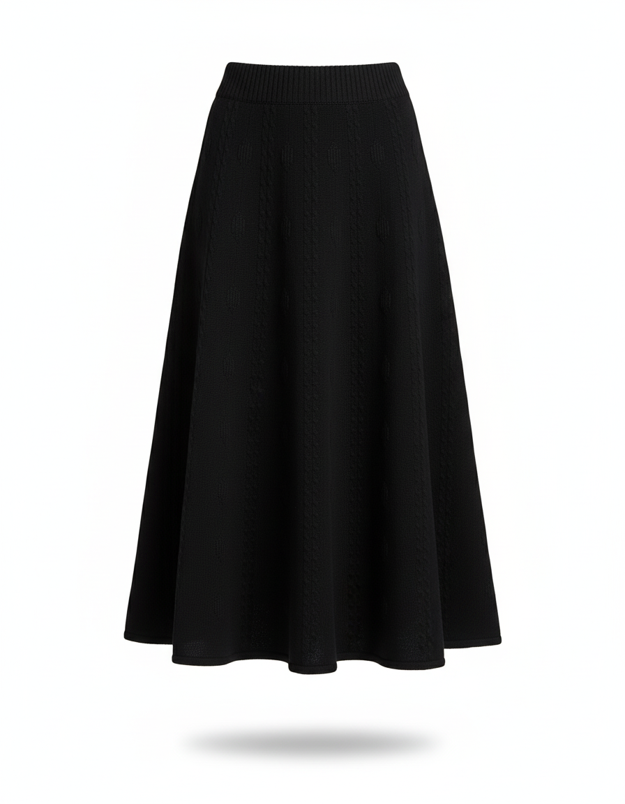 Cette jupe est une jupe mi-longue de couleur noire. Elle présente un motif tricoté et une coupe évasée de type parapluie.