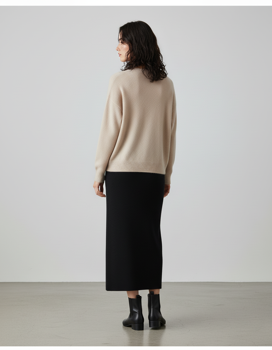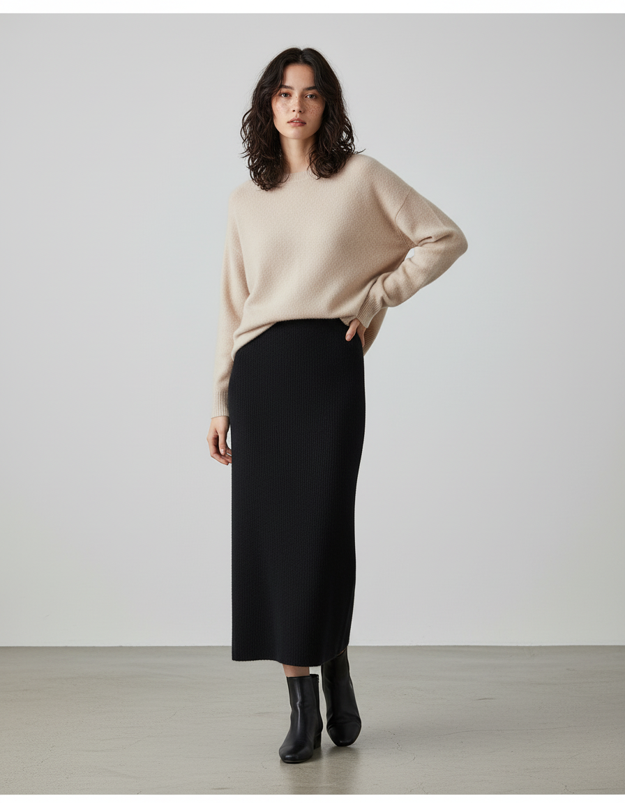 La Jupe Midi Noire Côtelée Élégante est la pièce maîtresse d'une garde-robe intelligente et minimaliste. Pour un look professionnel impeccable, associez-la à un chemisier en soie fluide et des talons structurés. Sa silhouette droite et épurée s'adapte parfaitement à l'environnement du bureau. Mais sa versatilité ne s'arrête pas là : pour une sortie décontractée chic, optez pour un pull oversize en cachemire et des bottines. En soirée, transformez-la avec un top ajusté et des accessoires audacieux, elle incarne l'élégance sans effort, quelle que soit l'occasion.