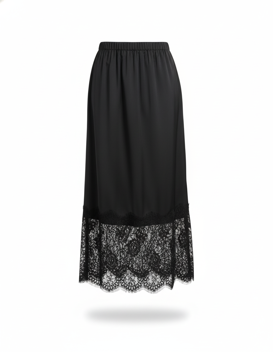 Une jupe midi de couleur noire avec une bordure en dentelle sur le bas. La taille est élastiquée et le tissu est uni.